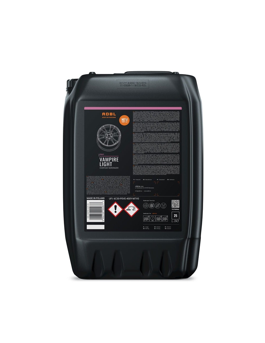 ADBL Vampire Light to delikatniejsza, ale wciąż skuteczna wersja kultowego deironizera. Wydajna i żelowa formuła, która pozwala na bezpieczne usuwanie zanieczyszczeń metalicznych z lakieru oraz felg, bez ryzyka dla delikatnych powierzchni. Wersja 25L to rozwiązanie dla profesjonalistów – maksymalna wydajność, minimum kosztów.