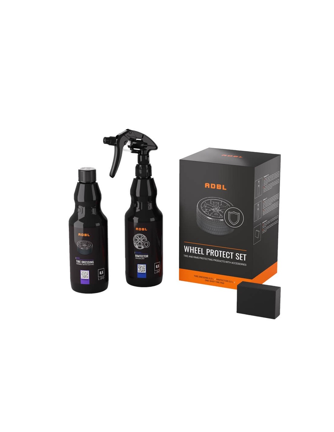 ADBL Wheel Protect Set – to zestaw trzech produktów, dzięki którym łatwo i szybko zabezpieczysz opony i felgi w swoim aucie. ADBL RIMTECTOR to wyjątkowo skuteczny i prosty w użyciu produkt do zabezpieczenia lakierowanych felg. Używany po każdym myciu, tworzy barierę ochronną, zapobiegającą trwałemu osadzaniu się zabrudzeń, przez co kolejne mycie staje się łatwiejsze i szybsze. Po aplikacji na mokro szczelnie pokrywa felgę, nadając jej połysk bez ryzyka powstania nieestetycznych śladów. Produkt utrzymuje się na feldze nawet kilka tygodni, w zależności od warunków atmosferycznych oraz użytych środków do bieżącego mycia. ADBL TIRE DRESSING w parze z ADBL ONE SHOT TIRE PAD pozwolą przywrócić oponom fabryczny wygląd. Już po jednej aplikacji otrzymujemy efekt przyciemnienia, satynowego połysku oraz ochrony przed brudem, wodą oraz promieniowaniem UV.