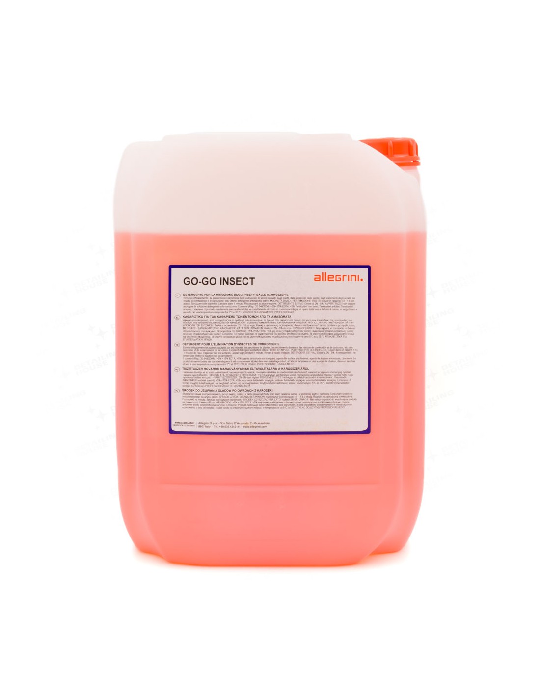 Allegrini GO-GO Insect – to specjalny detergent do usuwania pozostałości owadów z nadwozia. Skutecznie usuwa brud, owady, wydzielin roślinnych, odchody ptaków, oraz zanieczyszczenia z powietrza itp. Z przedniej szyby i nadwozia. To doskonały detergent, zapobiegający powstawaniu plam. Nasz sklep poleca ten środek dla zawodowców, a także indywidualnym użytkownikom. Zanieczyszczenia pochodzące z natury to częsta przyczyna uszkodzeń i pogorszenia stanu powłoki lakierniczej auta. Specjalistyczny preparat GO-GO Insect został stworzony z myślą o zneutralizowaniu i bezpiecznym usunięciu śladów po owadach oraz ptasich odchodów. Wykorzystywany przez profesjonalny detailing uwalnia karoserię od nieestetycznych śladów i przebarwień. Zabezpiecza też samochody przed skutkami przywierania pyłków, spadzi i innych substancji. Sposób użycia: Stosuj na zimny i suchy lakier!!! Spryskaj powierzchnie szyb i lakieru zabrudzone owadami. Nie pozwól, aby produkt odparował. Następnie spłucz wodą pod ciśnieniem lub spianuj auto. Pianowanie wydłuży czas działania preparatu GO-GO Insect, co może przełożyć się na skuteczność. Pojemność: 20 L