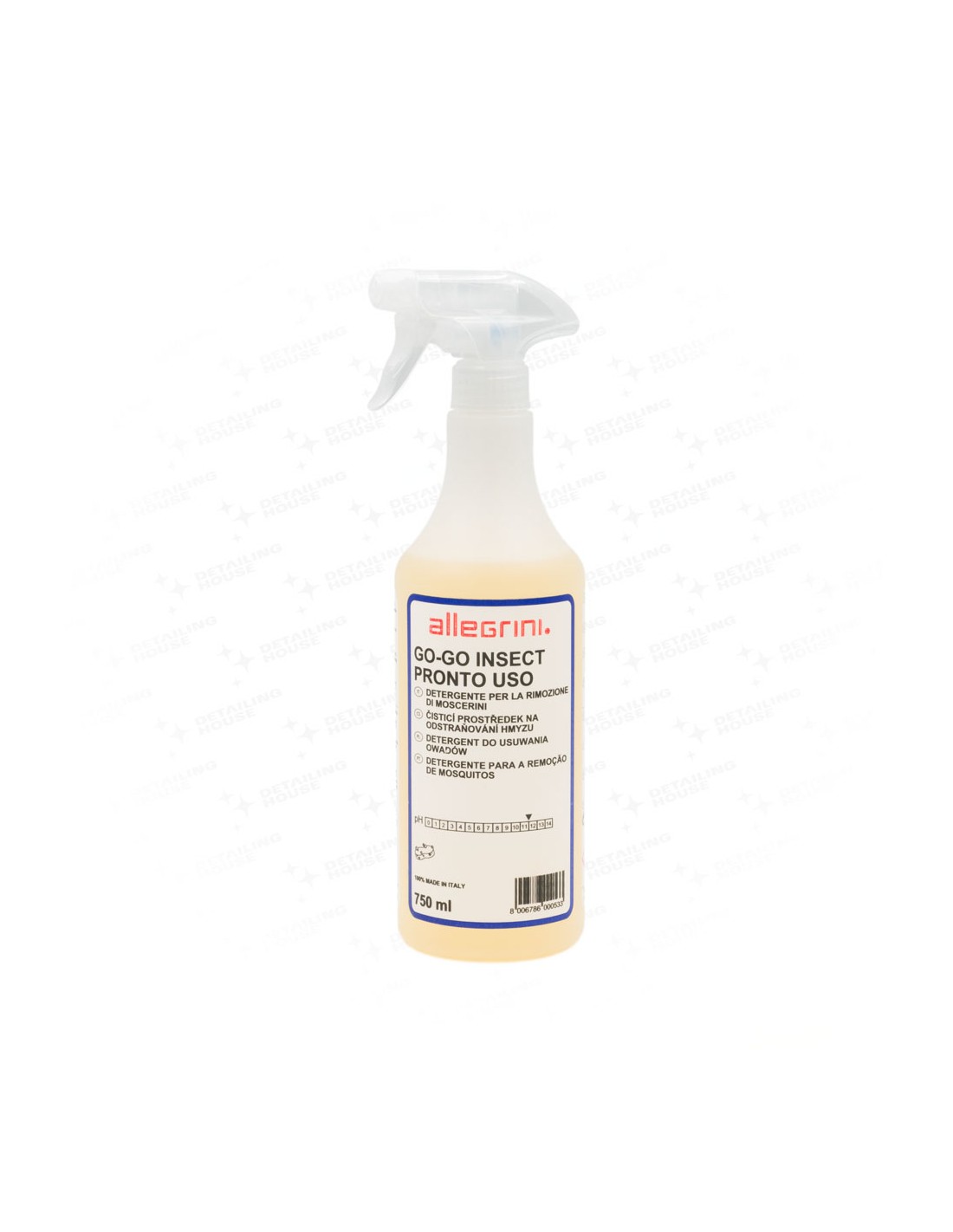 Allegrini GO-GO Insect – to specjalny detergent do usuwania pozostałości owadów z nadwozia. Skutecznie usuwa brud, owady, wydzielin roślinnych, odchody ptaków, oraz zanieczyszczenia z powietrza itp. Z przedniej szyby i nadwozia. To doskonały detergent, zapobiegający powstawaniu plam. Nasz sklep poleca ten środek dla zawodowców, a także indywidualnym użytkownikom. Zanieczyszczenia pochodzące z natury to częsta przyczyna uszkodzeń i pogorszenia stanu powłoki lakierniczej auta. Specjalistyczny preparat GO-GO Insect został stworzony z myślą o zneutralizowaniu i bezpiecznym usunięciu śladów po owadach oraz ptasich odchodów. Wykorzystywany przez profesjonalny detailing uwalnia karoserię od nieestetycznych śladów i przebarwień. Zabezpiecza też samochody przed skutkami przywierania pyłków, spadzi i innych substancji. Sposób użycia: Stosuj na zimny i suchy lakier!!! Spryskaj powierzchnie szyb i lakieru zabrudzone owadami. Nie pozwól, aby produkt odparował. Następnie spłucz wodą pod ciśnieniem lub spianuj auto. Pianowanie wydłuży czas działania preparatu GO-GO Insect, co może przełożyć się na skuteczność. Pojemność: 750 ml