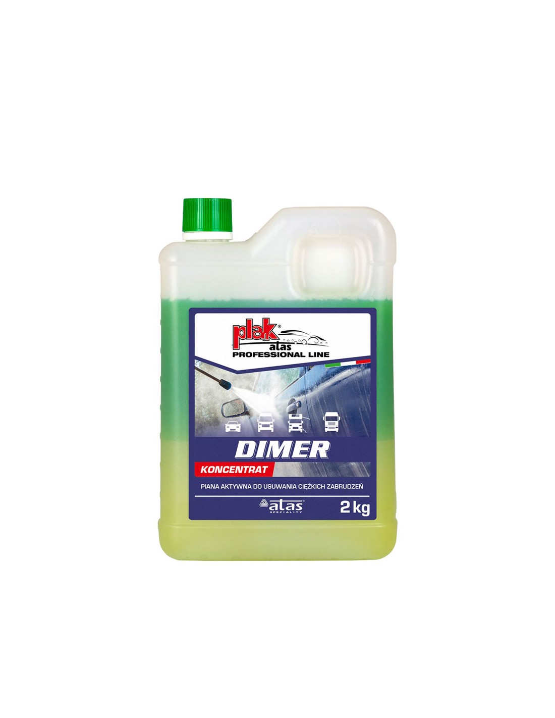 Atas Dimer – wysoce skoncentrowany dwuskładnikowy preparat pianotwórczy do mycia zewnętrznego, posiadający właściwości czyszczące i odtłuszczające. Bardzo wiele zastosowań preparatu sprawia, że doskonale usuwa wszelkiego rodzaju zabrudzenia z powierzchni: karoserii, podwozi, kół, części aluminiowych, plandek, naczep, maszyn budowlanych i przemysłowych, ciągników siodłowych, wagonów kolejowych, posadzek w garażach i warsztatach oraz innych powierzchni twardych o wysokim stopniu zabrudzenia. Dokładnie myje i odtłuszcza bez konieczności używania gąbki lub szczotki (usuwa wszelkie zabrudzenia). Atas Dimer piana aktywna koncentrat do myjek ciśnieniowych typu Karcher, pianownie / pianownice (lance pianotwórcze): silnie skoncentrowany preparat do usuwania ciężkich zabrudzeń, w tym tłustych plam ropopochodnych idealny do mycia plandek oraz karoserii samochodów ciężarowych posiada doskonałe właściwości pieniące i odtłuszczające może być stosowany w postaci piany lub oprysku po zmieszaniu z wodą przyjmuję postać aktywnej piany produkt zapewnia gęstą i stabilną pianę Produkt zalecany także do czyszczenia wyjątkowo silnie zabrudzonych powierzchni. Skuteczny w usuwaniu smarów. Preparat dwuskładnikowy o pH zasadowym. Nie zawiera fosforanów. Zastosowanie: Myjki wysokociśnieniowe – ustawienie mocy 4-7 atmosfer w zależności od dyszy. Proponowane rozcieńczenie z wodą w zależności od zastosowania zgodne z poniższą rozpiską: mycie wstępne: 1 do 70-100 mycie główne: 1 do 40-50 lanca pianotwórcza: 1 do 3 mycie samochodów osobowych: 1 do 40-70 mycie samochodów ciężarowych: 1 do 40-50 mycie naczep, kontenerów, plandek: 1 do 40-50 mycie podwozi i kół: 1 do 6-10 mycie zewnętrznych części silników: 1 do 6-10 czyszczenie posadzek, płyt lastryko: 1 do 40-60 mycie maszyn przemysłowych: 1 do 40-60 mycie wagonów kolejowych: 1 do 5-6 Lanca pianotwórcza (przykręcany do lancy pojemnik z dozownikiem): zaleca się wstępne rozcieńczenie produktu 1:2 / 3 oraz ustawienie zaworu dozującego od 4% do 8% Zalecenia: W okresie letnim zaleca się stosowanie preparatu na powierzchnie schłodzone lub w miejscu zacienionym. W przypadku stosowania należy unikać długotrwałego kontaktu produktu z częściami aluminiowymi i innymi stopami metali lekkich. Sposób użycia: Dokładnie wymieszać pojemnik aż do uzyskania jednolitej barwy roztworu, Rozcieńczyć preparat z wodą zgodnie z tabelą rozcieńczeń, Uzyskany roztwór rozpylić przy pomocy urządzenia ciśnieniowego lub pianotwórczego, Odczekać ok. 30 sekund, Spłukać obficie wodą. Pojemność: 2 kg