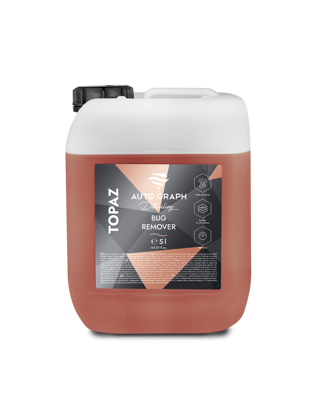 Auto Graph Topaz Bug Remover 5L to profesjonalny preparat do skutecznego usuwania owadów oraz innych zanieczyszczeń organicznych z karoserii, szyb, lusterek i reflektorów. Dzięki swojej wydajnej formule w dużej pojemności 5L jest idealny zarówno dla profesjonalnych warsztatów, jak i dla użytkowników indywidualnych szukających produktu o dużej efektywności. Bezpieczny dla lakieru i delikatnych powierzchni, nie powoduje smug ani zacieków.