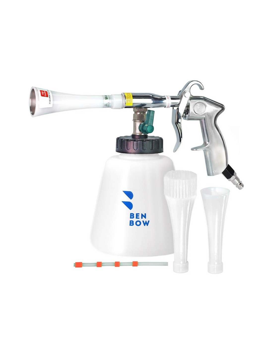 Wytrzymały pistolet czyszczący Benbow Metal 234 to doskonałe narzędzie dla profesjonalistów intensywnie korzystających z urządzeń do czyszczenia tapicerki i wnętrza pojazdu. Zestaw zawiera komplet dodatkowych akcesoriów zwiększających jego funkcjonalność i trwałość. Zestaw premium – w komplecie dwie dodatkowe tuby oraz wężyk silikonowy do szybkiej wymiany. Wydajność i precyzja – specjalna dysza z wirującym rdzeniem tworzy pianę pod wpływem sprężonego powietrza, skutecznie usuwając zabrudzenia przy minimalnym zużyciu wody i środków czyszczących. Wszechstronność zastosowań – idealny do czyszczenia wylotów powietrza, tapicerki, plastików, siedzeń, dywaników i trudno dostępnych miejsc. Bezpieczna praca – lekka, biała tuba z trwałego tworzywa nie rysuje czyszczonych powierzchni. Ekologiczne rozwiązanie – oszczędność wody i chemii, przy jednoczesnym zachowaniu wysokiej skuteczności. Benbow 234 to niezastąpione narzędzie w każdym profesjonalnym studiu auto detailingu.