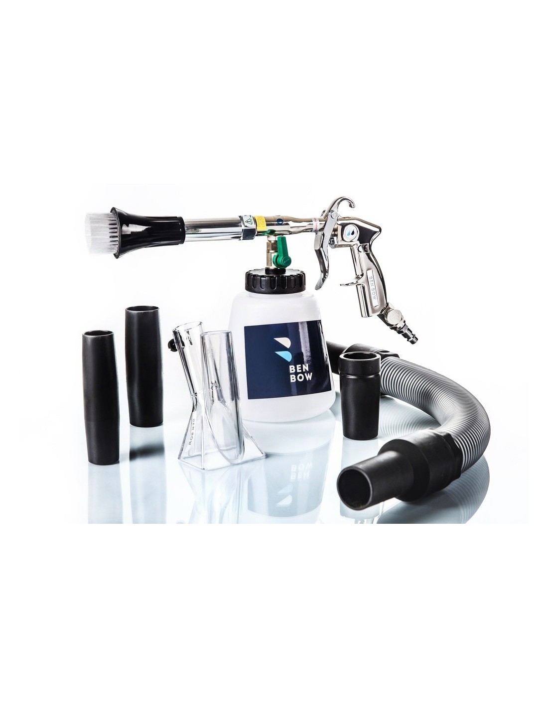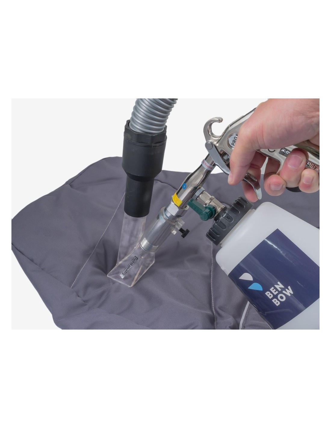 Urządzenie może pracować w dwóch trybach: z odciągiem wody lub bez odciągu, po wymianie dyszy. W trybie z odsysaniem wody, pistolet tworzy spieniony roztwór czyszczący, który skutecznie usuwa zabrudzenia z tapicerki, dywaników, siedzeń, wnętrza samochodu (w tym wylotów powietrza, klimatyzacji oraz elementów lustrzanych i plastikowych). Dzięki specjalnie zaprojektowanej dyszy z wirującym rdzeniem, BenBow 055 generuje efekt wiru przypominający tornado, który ułatwia podnoszenie brudu i przyspiesza proces suszenia tapicerki.