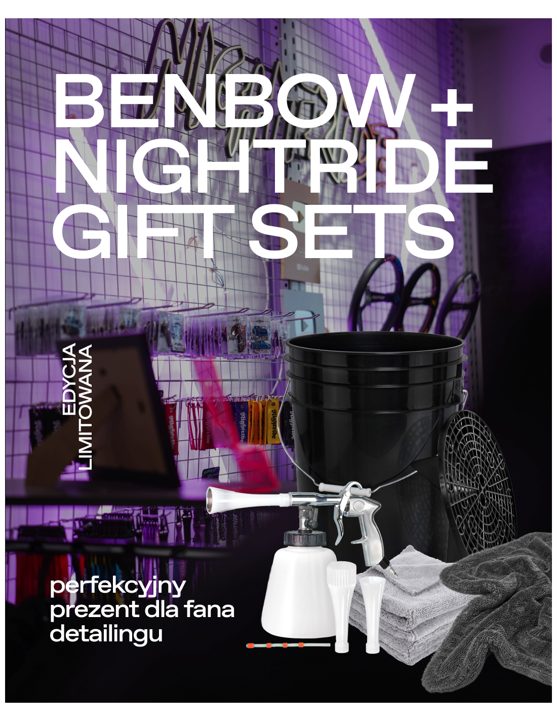 Zestaw zrodzony ze współpracy firmy Benbow z chłopakami z Nightride. W skład zestawu Gift Set wchodzi: - Pistolet piorący Benbow 234 - Wiadro Detailingowe - Separator - Zestaw trzech mikrofibr