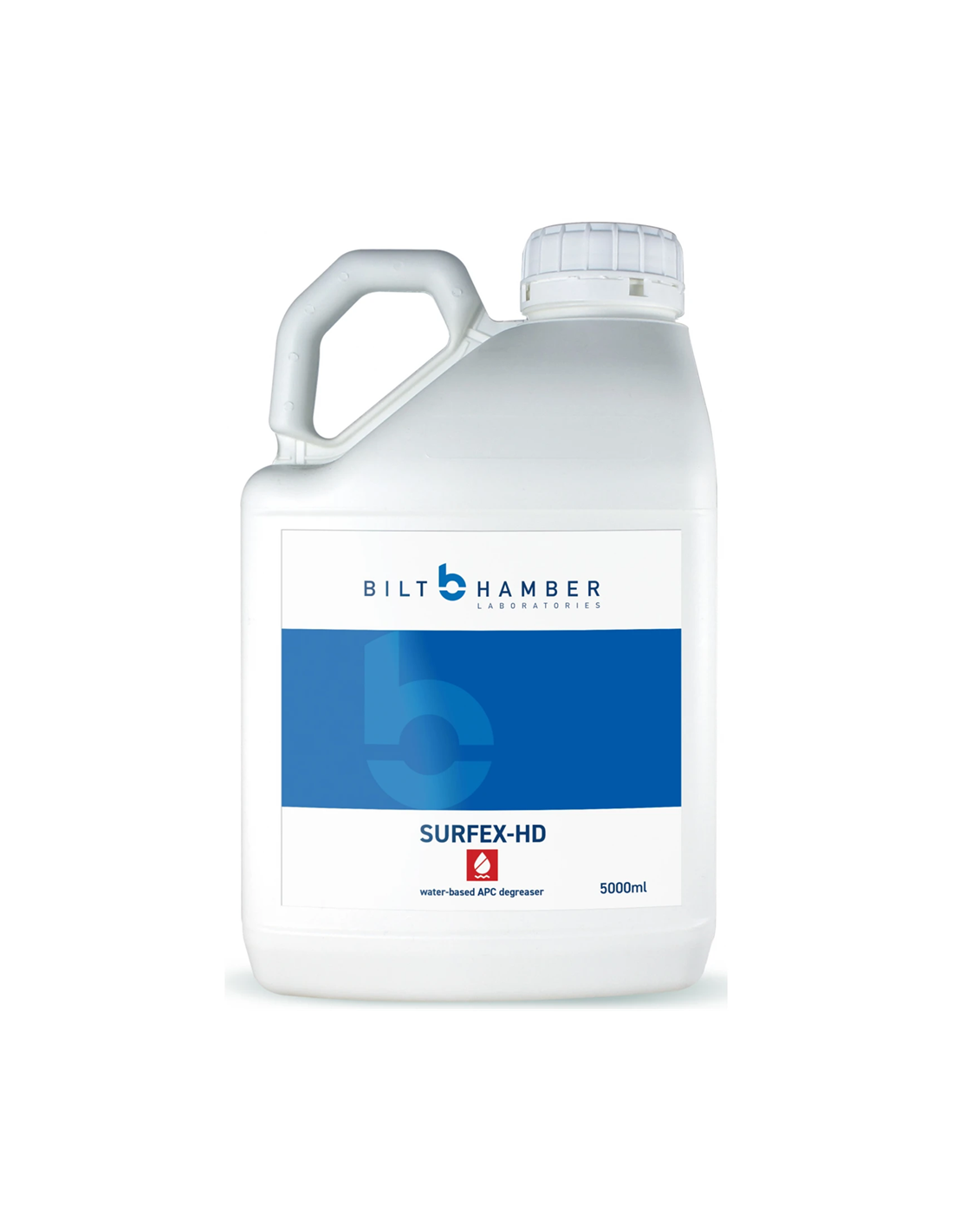 Bilt Hamber Surfex HD – to skoncentrowany produkt typu APC (All Purpose Cleaner). Jest to wydajny, wielozadaniowy środek czyszczący, który w zależności od potrzeb, można stosować w rozcieńczeniu z wodą. W większym stężeniu można go bezpiecznie używać do czyszczenia lakieru, felg, opon, elementów komory silnika etc. Dla opornych, najcięższych zabrudzeń stosować bez rozcieńczenia. Do czyszczenia powierzchni wnętrza samochodu takich jak tworzywa, tapicerka materiałowa etc. można stosować w rozcieńczeniu z wodą nawet w stosunku 1:200. Surfex HD jest środkiem opartym na bazie wody, nietoksycznym, biodegradowalnym. Nie zawiera lotnych związków organicznych. Sposób użycia: Stosuj zawsze na ostudzonej powierzchni. Rozcieńcz produkt z wodą w zależności od potrzeb. 1:200 dla delikatnych materiałów. 1:100 dla lekkich zabrudzeń. Stosuj bez rozcieńczenia do czyszczenia najcięższych, opornych zabrudzeń. Nakładaj za zabrudzoną powierzchnię za pomocą spryskiwacza, szmatki lub szczotki. Spłucz wodą. Pojemność: 5 L