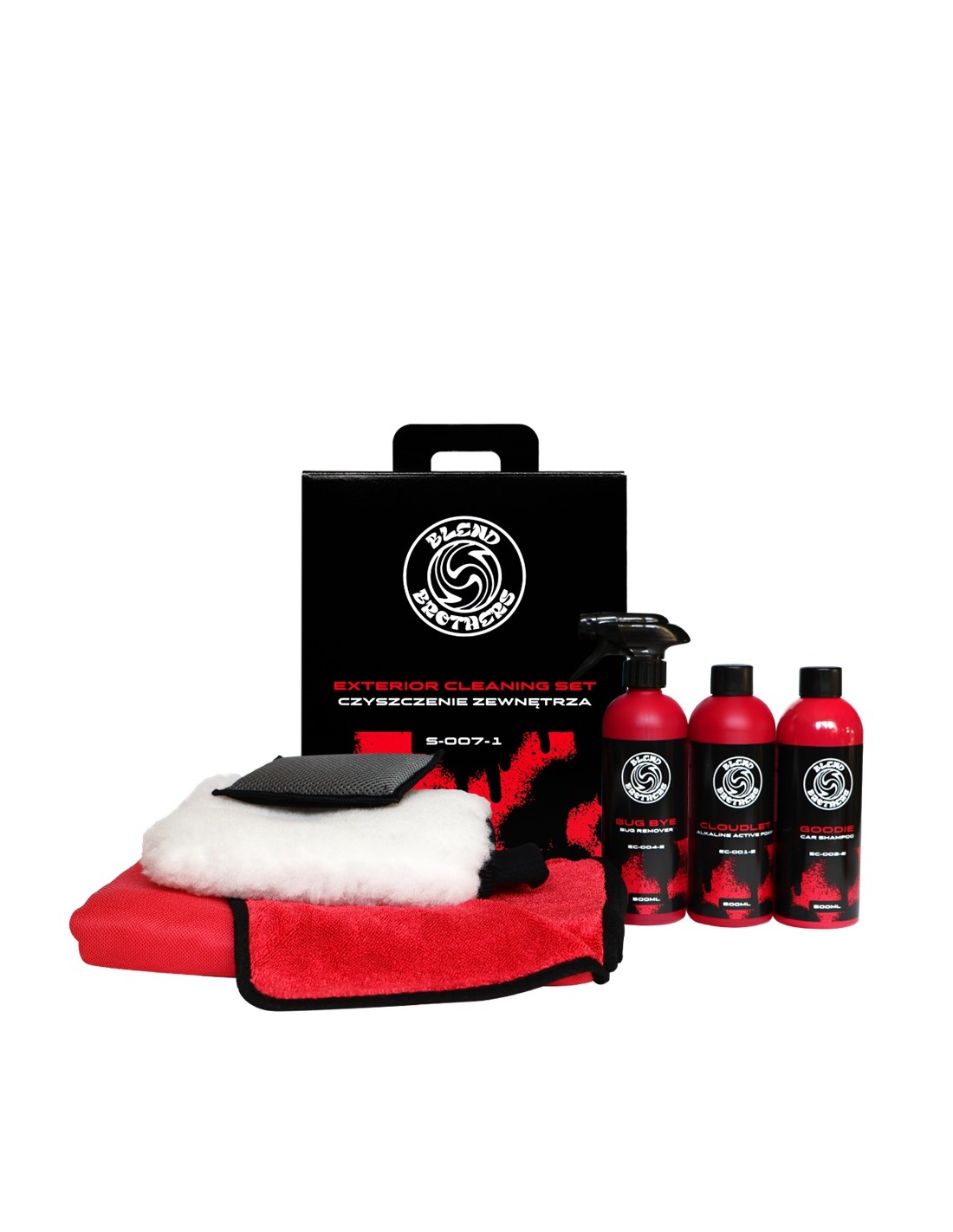BLEND BROTHERS Exterior Cleaning Set to kompletny zestaw do dokładnego i bezpiecznego mycia karoserii. Stworzony z myślą o pasjonatach detailingu i wymagających użytkownikach, którzy chcą kompleksowo zadbać o wygląd swojego auta. Zestaw zawiera profesjonalne kosmetyki oraz akcesoria, które umożliwiają skuteczne i przyjemne czyszczenie zewnętrznych elementów samochodu. Zawartość zestawu: Bug Bye – preparat do szybkiego i skutecznego usuwania owadów z przedniego pasa, szyb, reflektorów i lusterek. Cloudet – piana aktywna o wysokiej skuteczności, która zmiękcza i rozpuszcza zabrudzenia przed myciem właściwym. Goodie – skoncentrowany szampon samochodowy o dużej sile czyszczenia i doskonałym poślizgu, bezpieczny dla powłok i wosków. Ręcznik do osuszania Craftie – bardzo chłonny, bezpieczny dla lakieru ręcznik do szybkiego i skutecznego osuszania auta bez smug i zarysowań. Rękawica z wełny – miękka i bezpieczna rękawica do ręcznego mycia, zapewniająca doskonały poślizg i minimalizująca ryzyko zarysowań. Pad do usuwania robaków – specjalistyczny pad do skutecznego usuwania owadów bez uszkadzania lakieru. Zalety zestawu: Kompletny zestaw do mycia zewnętrznego auta – kosmetyki + akcesoria, Bezpieczne dla wszystkich typów lakieru, powłok i folii, Idealny zarówno dla amatorów, jak i profesjonalnych detailerów, Oszczędność czasu i pieniędzy – wszystko, czego potrzebujesz, w jednym opakowaniu.