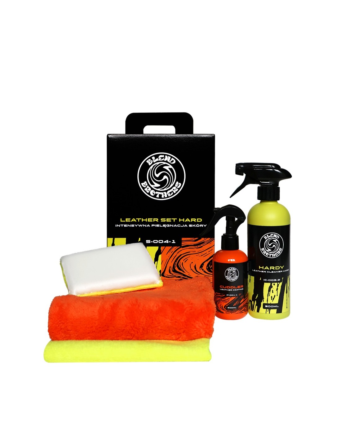 Blend Brothers Leather Set Hard to kompleksowy zestaw przeznaczony do głębokiego czyszczenia i regeneracji skórzanej tapicerki samochodowej. Skierowany do wymagających użytkowników, którzy potrzebują skutecznych, ale bezpiecznych rozwiązań. Dzięki niemu przywrócisz skórze pierwotny wygląd, elastyczność i trwałość, a eleganckie opakowanie sprawia, że zestaw świetnie nadaje się również na prezent. Zawartość zestawu: Blend Brothers HARDY 500ml – silny środek do głębokiego czyszczenia skóry. Skutecznie usuwa zabrudzenia, tłuszcz i osady, przygotowując powierzchnię do dalszej pielęgnacji. Blend Brothers CUDDLER 200ml – odżywka i powłoka ochronna do skóry. Zabezpiecza przed przesuszeniem, pękaniem i blaknięciem, przywracając elastyczność i miękkość. Frisky – Scrub Pad – miękki pad do bezpiecznego, ale efektywnego czyszczenia skóry. Blankie – uniwersalna mikrofibra – do rozprowadzania i docierania produktów. Plushie – pluszowa mikrofibra – do końcowego polerowania i nadania idealnego wykończenia. Zalety zestawu: Głębokie, skuteczne czyszczenie i regeneracja skórzanej tapicerki, Bezpieczny dla skór nowoczesnych i starszych, Kompletne rozwiązanie w jednym opakowaniu, Świetny wybór dla profesjonalistów i entuzjastów detailingu, Stylowe opakowanie – idealny na prezent.