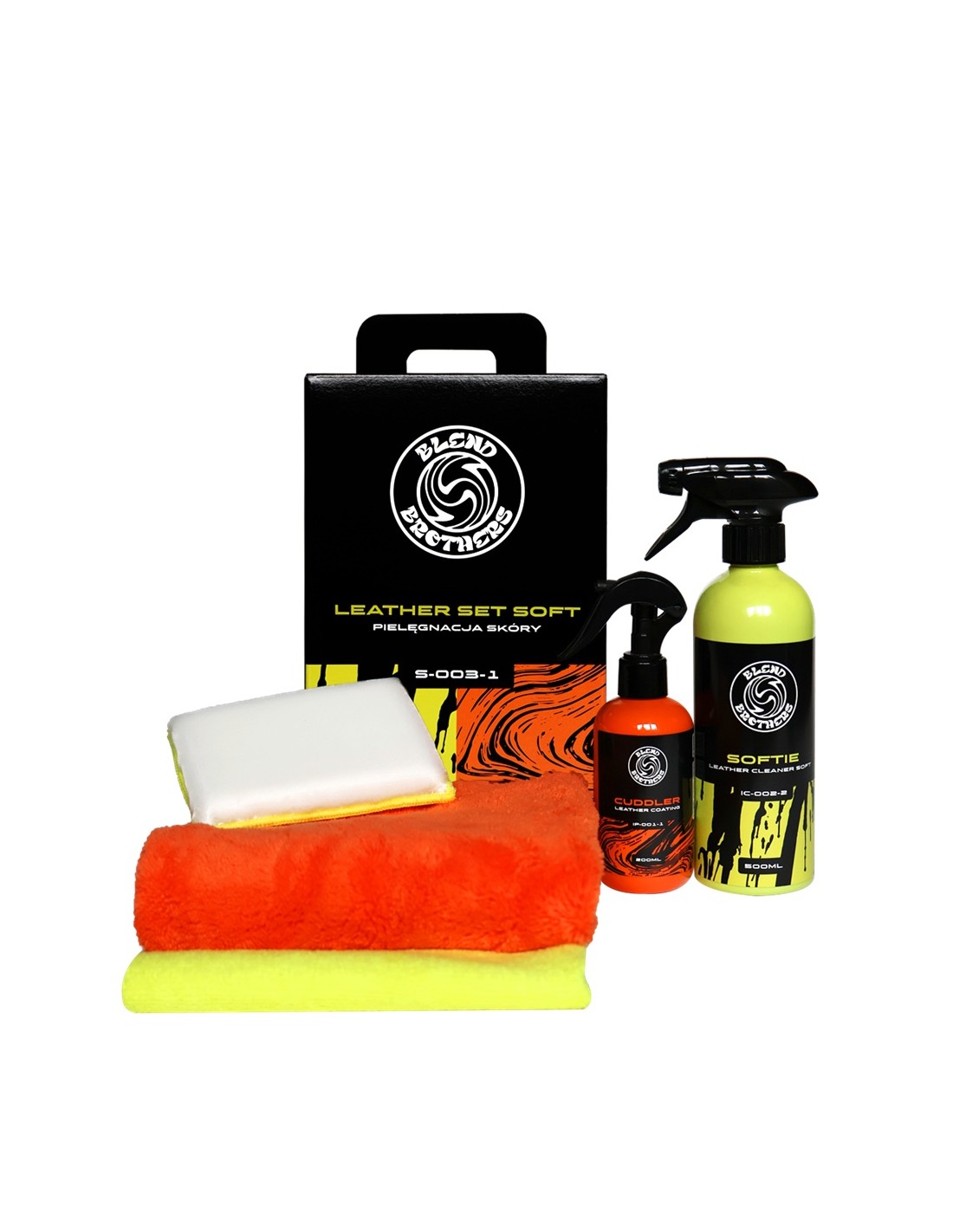 Blend Brothers Leather Set Soft to starannie skomponowany zestaw do regularnej i łagodnej pielęgnacji skórzanej tapicerki samochodowej. Zawiera wszystko, czego potrzebujesz, by zadbać o czystość, odżywienie i długowieczność skóry w Twoim aucie – bezpiecznie i skutecznie. Całość zapakowana w eleganckie, poręczne opakowanie, które sprawdzi się zarówno do przechowywania, transportu, jak i jako gustowny prezent dla miłośnika motoryzacji. Zawartość zestawu: Blend Brothers SOFTIE 500ml – delikatny, ale skuteczny środek do czyszczenia skóry. Bezpieczny dla wszystkich rodzajów tapicerki skórzanej, usuwa zabrudzenia nie naruszając struktury skóry. Blend Brothers CUDDLER 200ml – odżywka i powłoka ochronna do skóry. Zapewnia elastyczność, miękkość i ochronę przed wysychaniem, promieniowaniem UV i codziennym zużyciem. Frisky – Scrub Pad – miękki pad do bezpiecznego, ale efektywnego czyszczenia tapicerki. Blankie – uniwersalna mikrofibra – do rozprowadzania i docierania produktów pielęgnacyjnych. Plushie – pluszowa mikrofibra – idealna do końcowego polerowania i nadania perfekcyjnego wykończenia. Zalety zestawu: Kompleksowa pielęgnacja skóry – czyszczenie + odżywianie + ochrona, Bezpieczny dla delikatnych skór i regularnego stosowania, Doskonały wybór dla miłośników estetyki i detali, Świetny pomysł na prezent – eleganckie i funkcjonalne opakowanie.