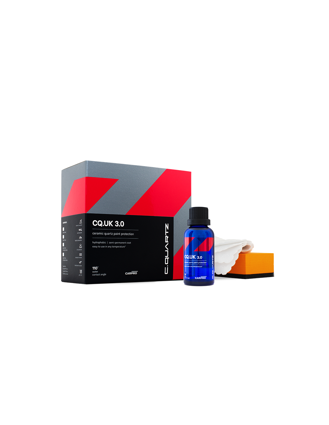 CQuartz UK Edition 3.0 – to kolejna ewolucja w dziedzinie powłok kwarcowych. W najnowszej wersji poprawiono połysk, zachowanie wody i odporność chemiczną. W skrócie produkt został udoskonalony w każdy możliwy sposób. Zwiększono również odporność na nagromadzoną sól drogową i chemię o pH 3-14. Zapewnia również ochronę przed działaniem promieniowa UV. Produkt charakteryzuje się teraz łatwiejszą aplikacją w temperaturach od 3°C do 40°C i wilgotnych strefach klimatycznych. Zachowano klasyczną aplikację CQuartz UK, powłoka może być natychmiast dotarta lub pozostawiona na kilka minut. Nie pozostawia lepkiej powierzchni i jest niezwykle łatwa w dotarciu. Jest idealnym rozwiązaniem dla entuzjastów detailingu lub profesjonalnych detailerów. Zapewnia trwałość na poziomie 18-24 miesięcy. Najważniejsze cechy: Zawiera 70% SiO2 (kwarcu) o czystości 99.9% Świetnie sprawdza się w zimnych lub ciepłych strefach klimatycznych Łatwa w dotarciu Odporność chemiczna na kwasy i zasady (pH 3-14) Odporność na sól Zestaw zawiera: Powłoka CarPro CQuartz UK 3.0 - 50 ml Aplikator kostkowy do powłok - 1 szt. Mikrofibra Microsuede do aplikacji powłoki 10x10cm - 5 szt. Mikrofibra Microsuede do docierania powłoki 40x40cm - 1 szt. Pojemność: 50 ml