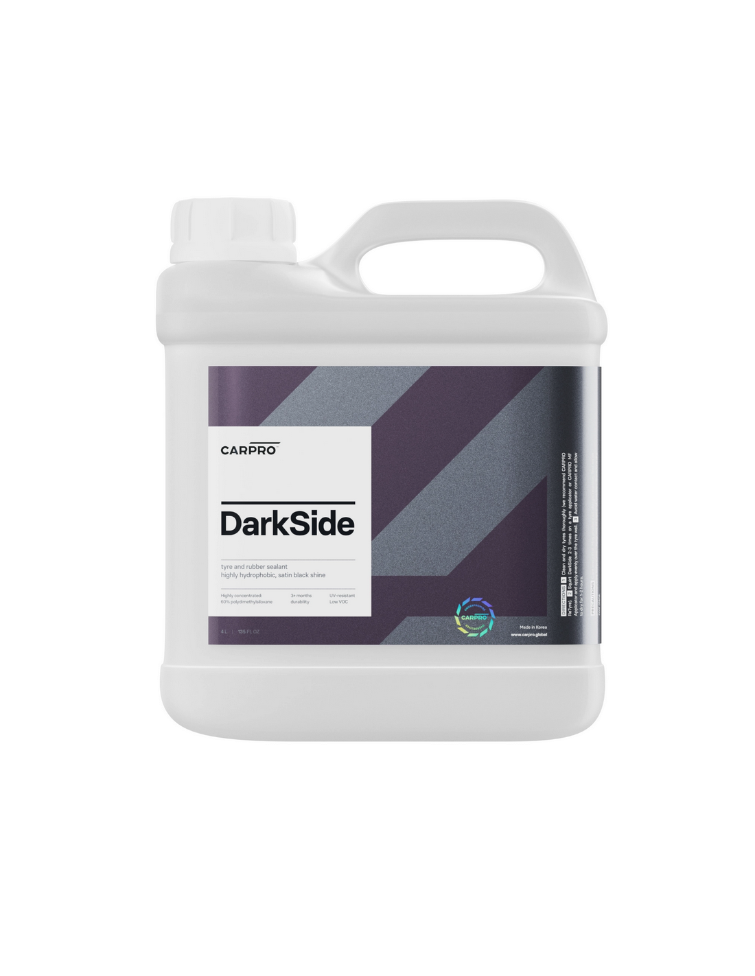 CarPro DarkSide – to silnie skoncentrowany dressing do opon i gumy. Formuła bazująca na 60% polidimetylosiloksanu pozwala na bardzo szybką i łatwą aplikację za pomocą dedykowanych aplikatorów do opon lub mikrofibry, pozostawiając piękny satynowy połysk. Produkt zapewnia dodatkowo świetnie właściwości samooczyszczania, hydrofobowe, a także ochronę przed promieniowaniem UV i chemikaliami.