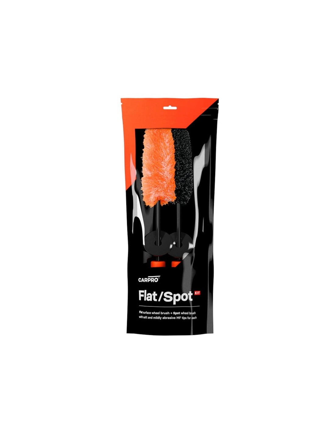 CarproCarPro FlatSpot Wheel Brush SET 2pcs - zestaw dwóch szczotek do czyszczenia felg, zaprojektowany, aby dotrzeć do każdego zakamarka nawet najbardziej skomplikowanych felg. Szczotka Flat o szerokości 55mm doskonale czyści wąskie przestrzenie między szprychami, nie tracąc przy tym efektywności czyszczenia bębna koła, podczas gdy wąska szczotka Spot o szerokości 12mm radzi sobie z najmniejszymi i najbardziej skomplikowanymi detalami obręczy.