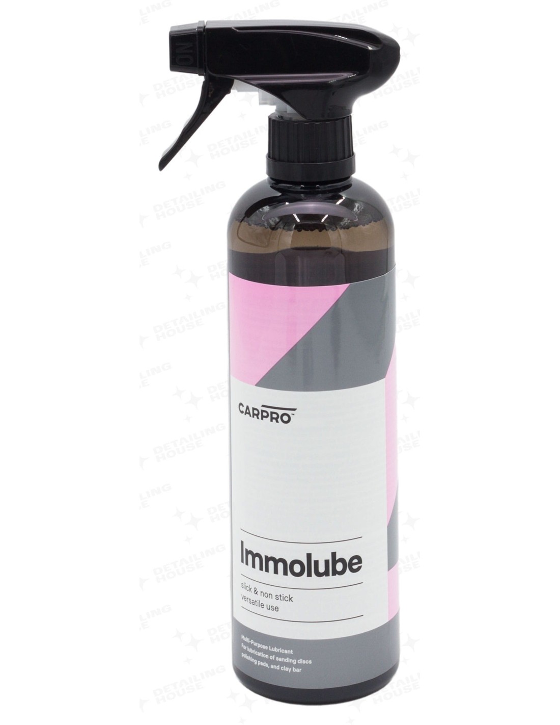 CarPro ImmoLube Multi Pourpose Lubricant – to produkt który został zaprojektowany w celu ułatwienia usuwania wszelakich zanieczyszczeń osadzonych na lakierze takich jak smoły, kleje, smary itp. Przeznaczony jest do używania z glinkami o różnych twardościach. Produkt ten delikatnie rozmiękcza osady dzięki czemu zmniejszamy ryzyko zarysowania lakieru podczas glinkowania.