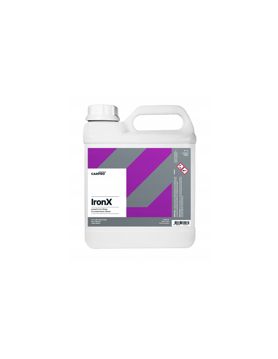 CarPro IronX – to zaawansowany produkt o neutralnym pH, przeznaczony do usuwania zanieczyszczeń metalicznych takich jak – pył z klocków hamulcowych, lotna rdza i inne zanieczyszczenia pochodzenia metalicznego. Produkt może być stosowany na lakier, tworzywa sztuczne, chromy, szkło oraz felgi aluminiowe. Podczas kontaktu z zanieczyszczeniami zabarwia się na ciemny fiolet, co powoduje efekt tzw. „krwawienia”. Dzięki zastosowaniu IronX, kolejne czynności detailingowe w tym glinkowanie, są o wiele szybsze i łatwiejsze. Sposób użycia: Produkt nanosimy na suchy i chłodny lakier. Pozostawiamy środek na 2-4 minuty. Nie dopuszczamy do wyschnięcia produktu. Jeśli zachodzi taka konieczność, wspomagamy działanie produktu za pomocą pędzelka, szczoteczki lub miękkiej gąbki. Dokładnie spłukujemy powierzchnię za pomocą wody pod ciśnieniem. Pojemność: 20 L