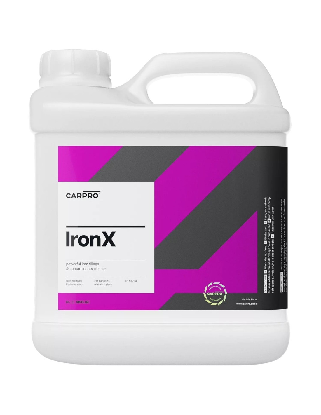 CarPro IronX – to zaawansowany produkt o neutralnym pH, przeznaczony do usuwania zanieczyszczeń metalicznych takich jak – pył z klocków hamulcowych, lotna rdza i inne zanieczyszczenia pochodzenia metalicznego. Produkt może być stosowany na lakier, tworzywa sztuczne, chromy, szkło oraz felgi aluminiowe. Podczas kontaktu z zanieczyszczeniami zabarwia się na ciemny fiolet, co powoduje efekt tzw. „krwawienia”. Dzięki zastosowaniu IronX, kolejne czynności detailingowe w tym glinkowanie, są o wiele szybsze i łatwiejsze.