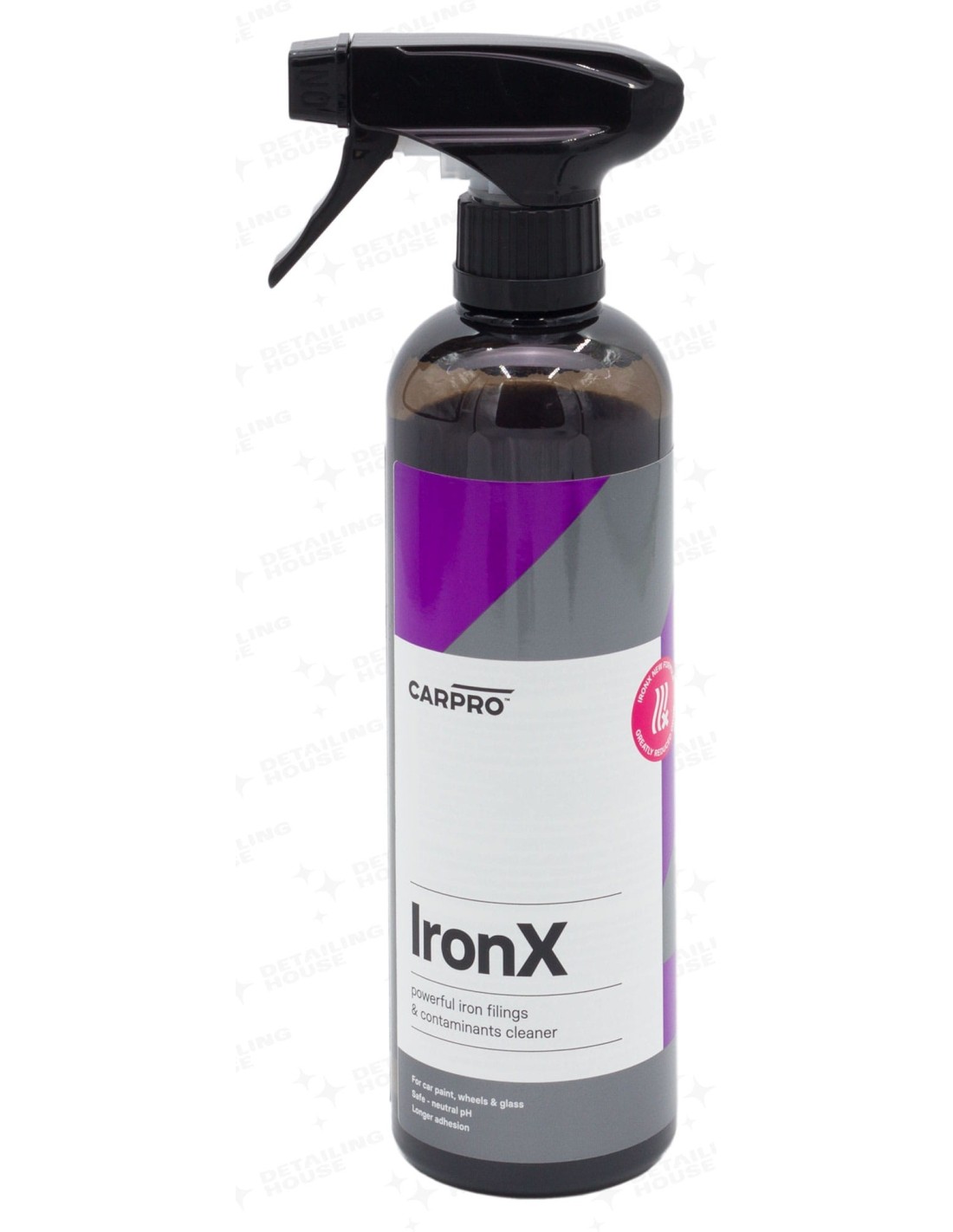 CarPro IronX – to zaawansowany produkt o neutralnym pH, przeznaczony do usuwania zanieczyszczeń metalicznych takich jak – pył z klocków hamulcowych, lotna rdza i inne zanieczyszczenia pochodzenia metalicznego. Produkt może być stosowany na lakier, tworzywa sztuczne, chromy, szkło oraz felgi aluminiowe. Podczas kontaktu z zanieczyszczeniami zabarwia się na ciemny fiolet, co powoduje efekt tzw. „krwawienia”. Dzięki zastosowaniu IronX, kolejne czynności detailingowe w tym glinkowanie, są o wiele szybsze i łatwiejsze.