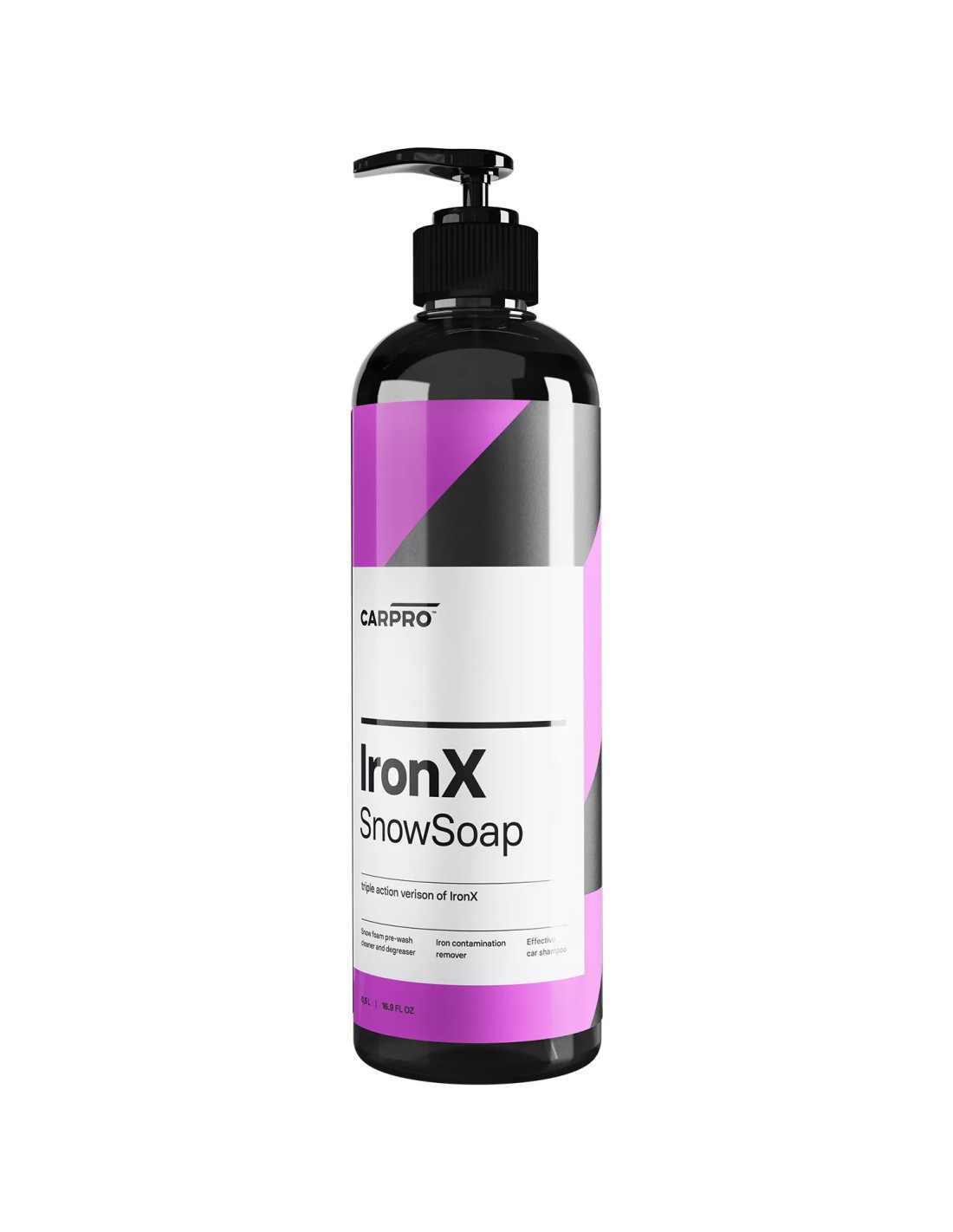 CarPro IronX Snow Soap – to produkt czyszczący, silnie skoncentrowany, efektywnie czyści wszelkie zabrudzone powierzchnie. Może być stosowany na powierzchniach lakierowanych, metalowych, szklanych, plastikowych oraz gumowych. IronX Snow Soap ma silne właściwości odtłuszczające powierzchnię i usuwające osady metaliczne z powierzchni lakieru. W zależności od stopnia rozcieńczenia IronX Snow Soap można stosować jako pianę aktywną lub szampon samochodowy. Produkt można również stosować jako lubrykant do glinkowania, a nawet środek do czyszczenia kół. Najważniejsze cechy: Neutralne pH. Wysoka lubrykacja. Najwyższej jakości środki czyszczące i emulgujące do mycia powierzchni samochodów. Z łatwością penetruje brud i film drogowy. Doskonały środek do czyszczenia kół. Delikatnie oczyszcza karoserię obfitą pianą. Bezpieczny dla lakieru, szkła, kół, reflektorów, plastików i bezbarwnej folii ochronnej. Rozcieńczenie: 1:8 – delikatna piana aktywna, 1:8 – szampon samochodowy (bezpieczny dla rąk), nierozcieńczony – dogłębne mycie wstępne. Nierozcieńczony IronX Snow Soap może naruszać woski, ale jest w pełni bezpieczny dla powłok kwarcowych i ceramicznych. Środki ostrożności: Stosować tylko do pielęgnacji pojazdów. Może być bezpiecznie stosowany na wszystkich samochodowych powierzchniach, również na elementach chromowanych. Jeżeli produkt jest aplikowany przy pomocy pianownicy, należy ją dokładnie wypłukać wodą po aplikacji! Należy używać produktu w pomieszczeniach z dobrą wentylacją oraz zacienionych Pojemność: 500 ml