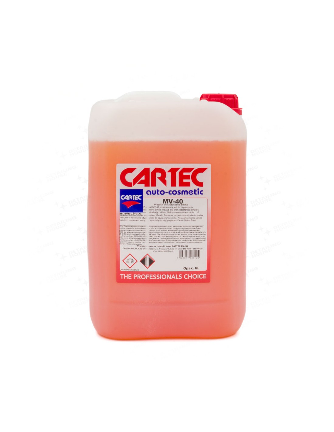 MV 40 to silnie skoncentrowany środek do mycia komory oraz części silnika. Usuwa skutecznie olej oraz pozostałości smarów nie uszkadzając lakieru. Nie zawiera rozpuszczalników i jest rozcieńczalny w wodzie. Maksymalne rozcieńczenie 20% - 1/10 SPOSÓB UŻYCIA: Spryskać środkiem komorę silnika. Następnie na krótki czas pozostawić pod działaniem, jeśli jest to konieczne użyj szczotki do mycia silnika. Następnie spłucz silnik wysokim ciśnieniem wody. Po wyschnięciu zastosuj Cartec Motor Fresh do konserwacji elementów z tworzyw sztucznych silnika.