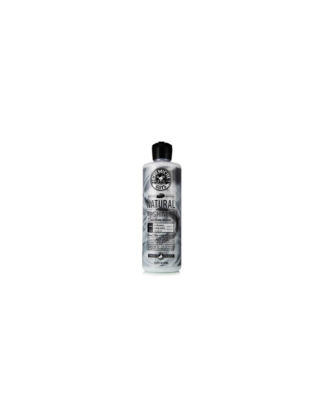 Chemical Guys Natural Shine Dressing - to odżywka, która pozostawia delikatny satynowy połysk na oponach, oraz wszystkich elementach vinylowych i plastikowych zarówno zewnątrz jak i wewnątrz pojazdu. Produkt na bazie wody charakteryzuje się łatwą aplikacją, jak i dużą odpornością na zmywanie.