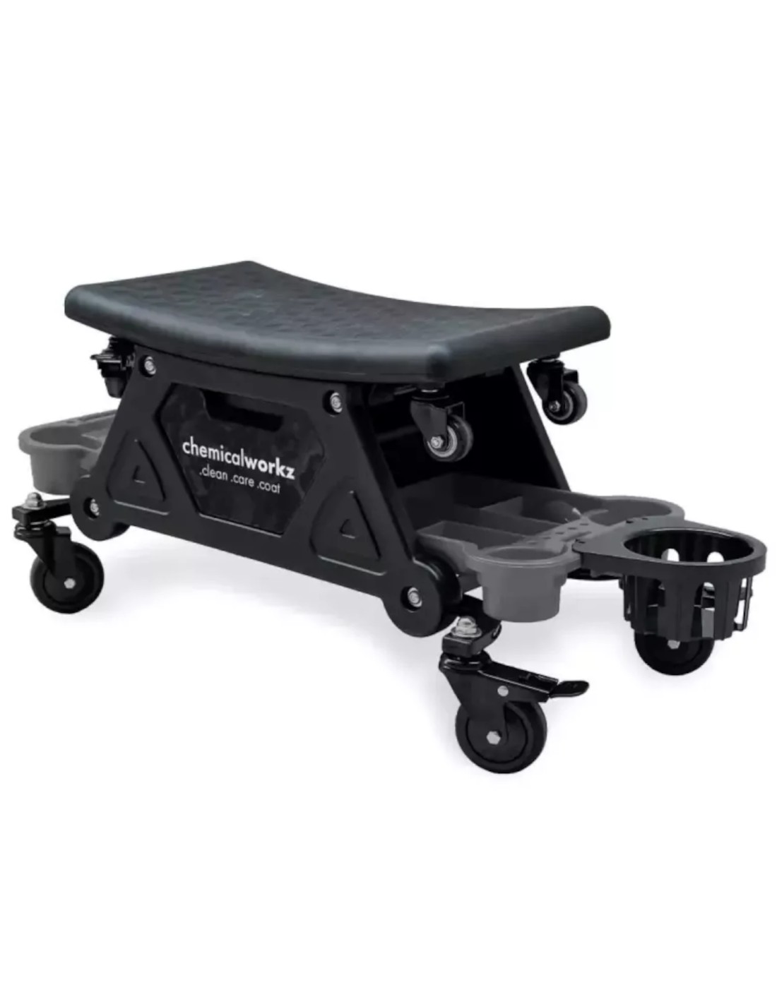 ChemicalWorkz Detailing Creeper to wyjątkowo ergonomiczny taboret warsztatowy, zaprojektowany z myślą o wygodzie i efektywności podczas prac detailingowych i serwisowych. Idealnie sprawdza się przy czyszczeniu felg, polerowaniu reflektorów, wymianie kół, serwisie hamulców oraz wielu innych zadaniach. Konstrukcja wykonana została z wytrzymałego, a jednocześnie lekkiego polietylenu, co zapewnia trwałość i łatwość manewrowania. Taboret wyposażono w kółka z elastycznej, antypoślizgowej gumy, które gwarantują stabilność i płynne przemieszczanie się. Dodatkowym atutem są praktyczne rozwiązania do przechowywania: dwie tacki na akcesoria i butelki oraz wysuwana szuflada, idealna na pędzle, mikrofibry, aplikatory czy narzędzia.