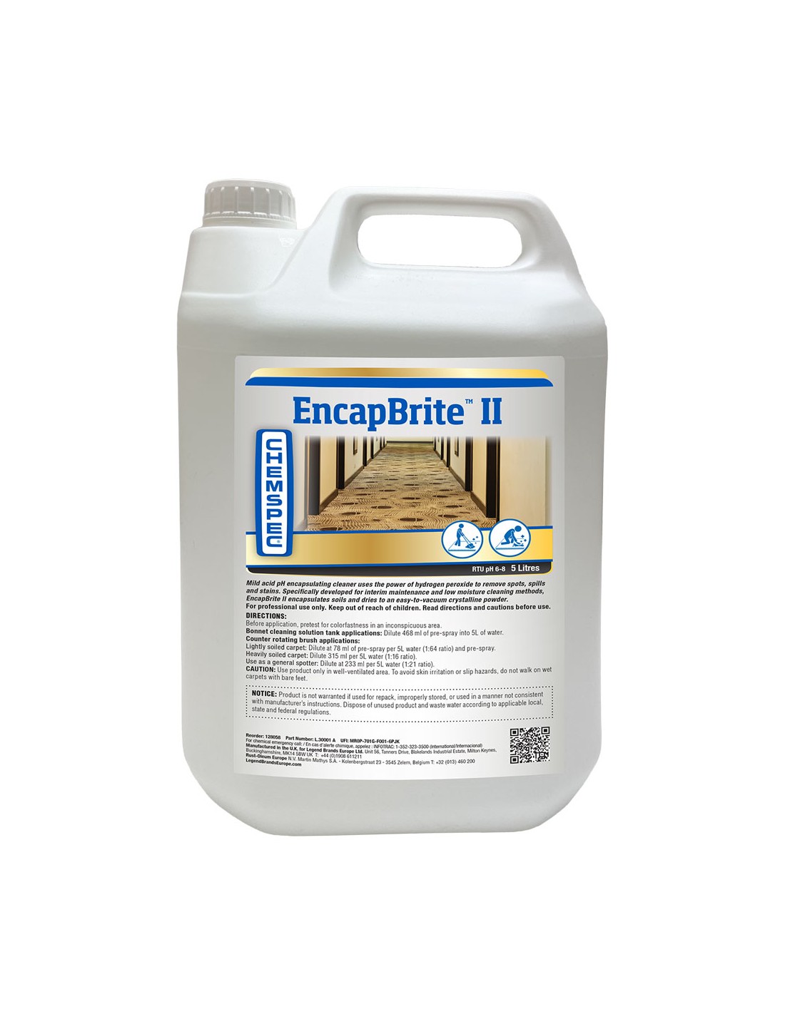 Środek do czyszczenia dywanów i wykładzin metodą bonetowania. Opracowany specjalnie do czyszczenia pielęgnacyjnego oraz przy niskiej wilgotności. Wygląd: przezroczysty płyn Zapach: łagodny pH: 6,0 – 7,0 Dozowanie: 95 ml na 1 l wody (w przypadku nanoszenia przy pomocy opryskiwacza) 15 ml na 1 l wody – lekkie zabrudzona wykładzina / dywan (w przypadku nanoszenia przy pomocy maszyny rotacyjnej) 60 ml na 1 l wody – mocne zabrudzona wykładzina / dywan (w przypadku nanoszenia przy pomocy maszyny rotacyjnej) 45 ml na 1 l wody – w przypadku używania jako odplamiacz Wydajność: zmienna RTU z opakowania: do 252 litrów Środek do czyszczenia dywanów i wykładzin metodą bonetowania. Opracowany specjalnie do czyszczenia pielęgnacyjnego oraz przy niskiej wilgotności. Wykorzystuje moc nadtlenku wodoru do skutecznego usuwania z powierzchni standardowych zanieczyszczeń, plam po napojach, takich jak kawa, herbata i napoje gazowane, a także niewielkich plam z atramentu/tuszu, smaru, oleju i smoły. Nie brązowieje i nie pozostawia resztek środka powierzchniowo czynnego, które mogą przyczynić się do ponownego zabrudzenia i zażółcenia dywanu. Podczas schnięcia EncapBrite II emulguje zabrudzenia w krystaliczny proszek, które można łatwo usunąć przy pomocy odkurzacza. Produkt przeznaczony do użytku dla profesjonalistów. Pojemność: 5L
