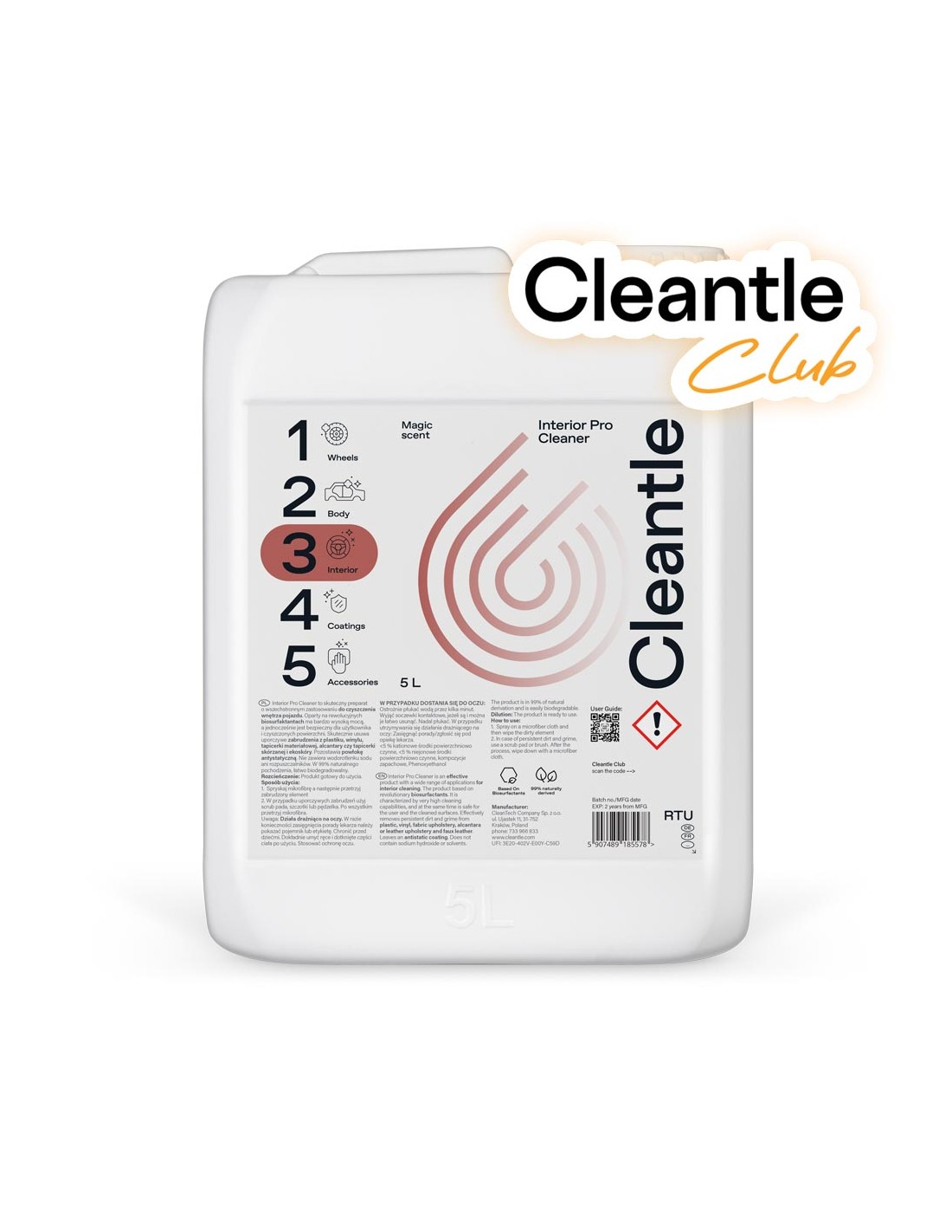 Interior Pro Cleaner to skuteczny i bezpieczny preparat o wszechstronnym zastosowaniu do czyszczenia wnętrza pojazdu. Produkt oparty na rewolucyjnych biosurfaktantach cechuje się bardzo wysoką mocą, a jednocześnie jest bezpieczny dla użytkownika i czyszczonych powierzchni. Skutecznie usuwa uporczywe zabrudzenia z plastiku, winylu, tapicerki materiałowej, alcantary czy tapicerki skórzanej i ekoskóry. Pozostawia powłokę antystatyczną, dzięki której mniej kurzu osiada we wnętrzu auta. Nie zawiera wodorotlenku sodu ani rozpuszczalników. Produkt w 98% naturalnego pochodzenia oraz łatwo biodegradowalny. Cechy produktu: Wysoka moc czyszczenia Bezpieczny dla czyszczonych powierzchni i użytkownika Oparty na biosurfaktantach Pozostawia powłokę antystatyczną Łatwo biodegradowalny Rozcieńczanie: Gotowy do użycia Sposób użycia: Spryskaj mikrofibrę a następnie przetrzyj zabrudzony element W przypadku uporczywych zabrudzeń użyj scrub pada, szczotki lub pędzelka. Po wszystkim przetrzyj mikrofibrą. Uwaga! Nie nanoś preparatu na rozgrzane powierzchnie i bezpośrednio w słońcu. Nie dopuść do wyschnięcia produktu. Uwaga: Działa drażniąco na oczy. W razie konieczności zasięgnięcia porady lekarza należy pokazać pojemnik lub etykietę. Chronić przed dziećmi. Dokładnie umyć ręce i dotknięte części ciała po użyciu. Stosować ochronę oczu. Pojemność 5 L