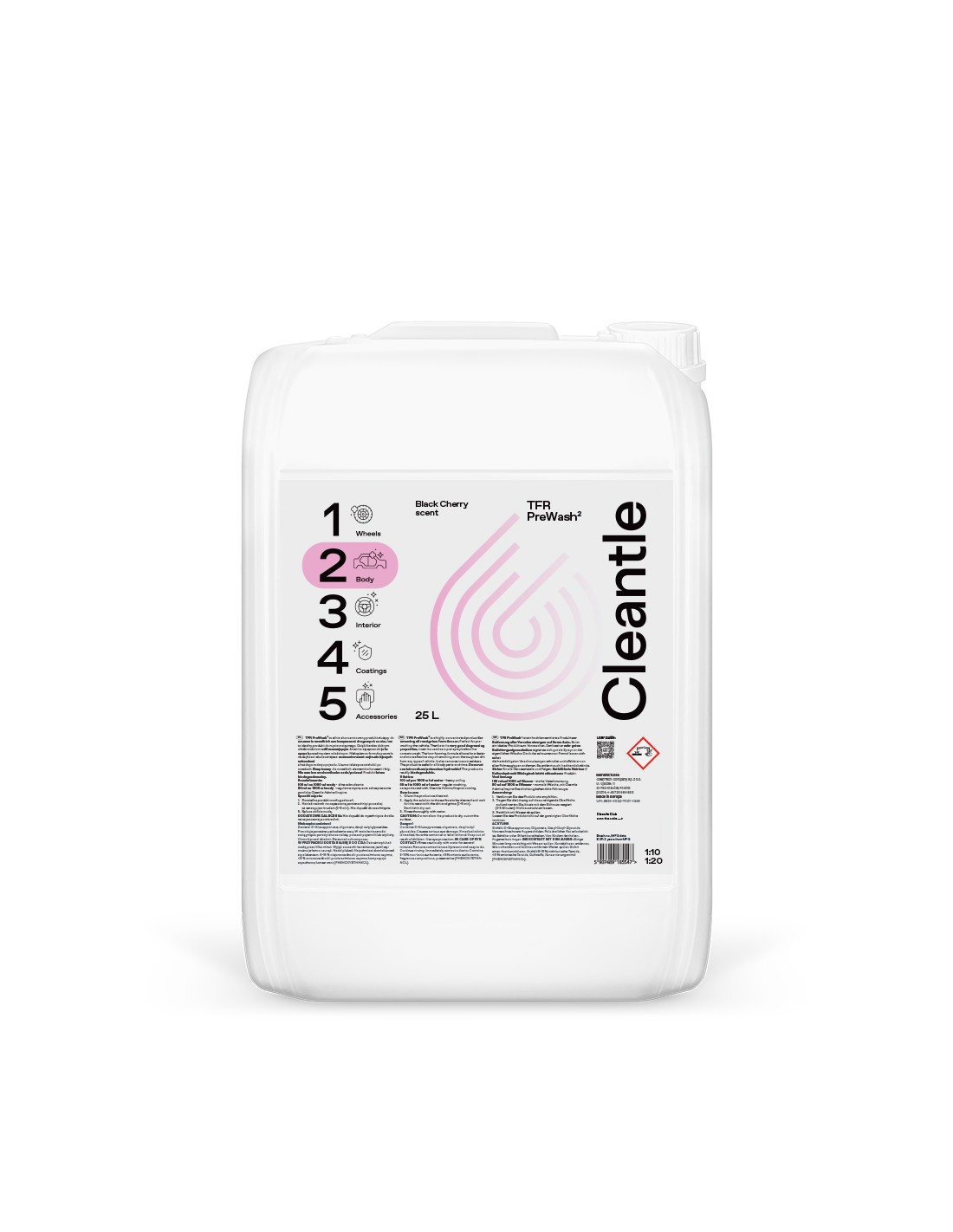 TFR PreWash2 to silnie skoncentrowany środek przeznaczony do usuwania trudnych zabrudzeń drogowych, idealny jako oprysk przed właściwym myciem auta. Jego nowa, odświeżona formuła o neutralnym pH (7,5 w koncentracie) zapewnia skuteczne domywanie porównywalne z mocno zasadowymi preparatami, jednocześnie dbając o bezpieczeństwo powierzchni. Preparat wzbogacono o nietoksyczne składniki oraz substancje chelatujące, które ułatwiają separację brudu, nawet w twardej wodzie. Produkt jest bezpieczny dla karoserii, felg, wosków i powłok, nie zawiera wodorotlenku sodu ani potasu, cechuje się niską pianą i jest łatwo biodegradowalny. Dodatkowym atutem jest przyjemny zapach Black Cherry. Pojemność: 25 L