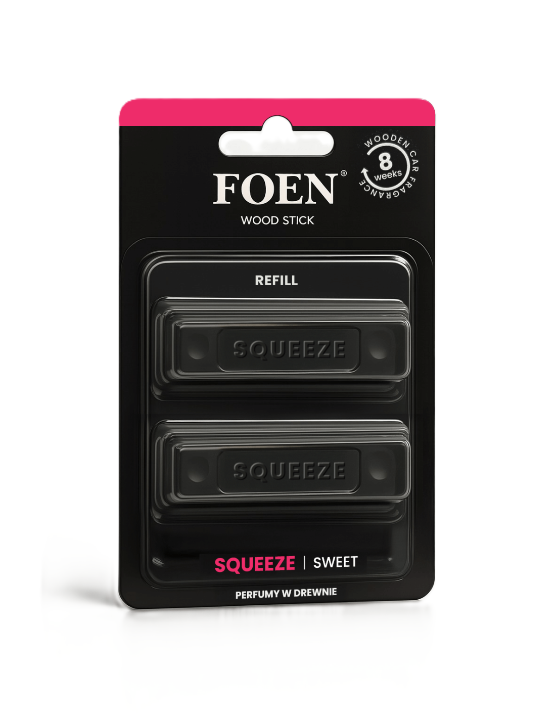 Orzeźwiający zapach do samochodu, który poprawia nastrój Zestaw dwóch wkładów zapachowych Foen Wood Stick Squeeze to idealne rozwiązanie dla osób, które pokochały świeżość, słodycz i tropikalną radość zamkniętą w drewnianym zapachu do auta. Każdy refill wystarcza nawet na 8 tygodni, co łącznie daje do 16 tygodni relaksującego, owocowo-ziołowego aromatu w Twoim pojeździe. Squeeze – tropikalny klimat, który zostaje z Tobą na długo Ten zapach otwiera się cytrusowo-owocowym orzeźwieniem: limonka, pomarańcza i soczysta truskawka sprawiają, że pierwsze nuty działają jak zimny napój w upalny dzień. Potem pojawia się delikatne ziołowe chłodzenie mięty i szałwii, a na końcu – miękka, otulająca wanilia. Efekt? Wyjątkowo odprężający zapach, który koi zmysły i nadaje każdej trasie pozytywny vibe. Piramida zapachowa: Nuta głowy: pomarańcza, limonka, truskawki Nuta serca: mięta, szałwia Nuta bazy: wanilia Dlaczego warto wybrać refill Foen Wood Stick Squeeze? Zestaw 2 wkładów = aż do 16 tygodni zapachu Naturalny, drewniany dyfuzor bez sztucznych zawieszek i nieprzyjemnych chemikaliów Zapach do auta, który naprawdę poprawia nastrój i odpręża Idealny wybór na lato, wakacyjne trasy i każdą chwilę, gdy chcesz dodać energii Refill pasuje do każdego Foen Wood Stick – szybka wymiana, zero komplikacji Foen Wood Stick Squeeze Refill (2 szt.) to więcej niż zapach do samochodu – to mała tropikalna ucieczka, którą możesz mieć zawsze pod ręką.
