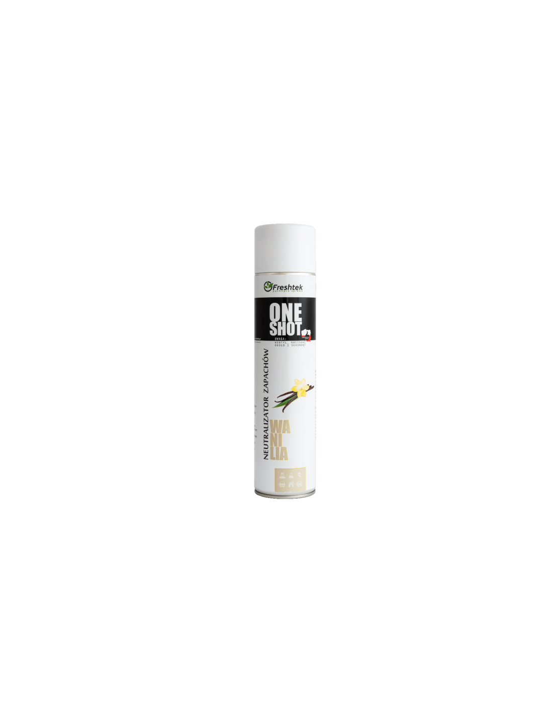 Freshtek One Shot Wanilia – środek o podwójnym działaniu – odświeżacza powietrza i neutralizatora nieprzyjemnych zapachów. Urzekający, słodki zapach wanilii, o kojących właściwościach.