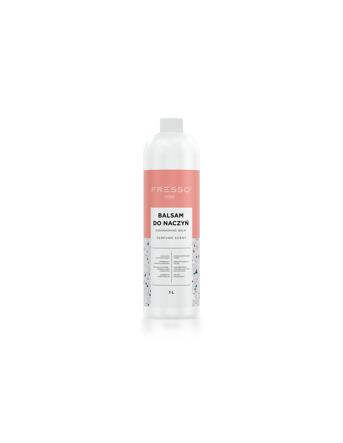 Balsam do mycia naczyń Fresso to bezapelacyjny profesjonalista w pozbywaniu się wszelkich zabrudzeń z Twoich naczyń. Jego receptura została stworzona tak, aby z pełną mocą usuwać tłuszcz i nawet zaschnięte pozostałości z zastawy stołowej, garnków, patelni, sztućców i innego wyposażenia kuchennego. Skutecznie skomponowane środki aktywne wraz z gęstą, aksamitną konsystencją sprawiają, że balsam bardzo dobrze się pieni, ułatwiając zmywanie. Formuła jest również wzbogacona o wyciąg z aloesu oraz kwasy AHA, przez co ma działanie regenerujące i pielęgnujące dla dłoni. W składzie produktu występuje przyjazny dla środowiska detergent na bazie oleju Canola (olej rzepakowy o przeznaczeniu kosmetycznym), który sprawia, że stosowanie produktu wpływa pozytywnie na nawilżenie, a w efekcie gładkość i miękkość Twojej skóry. Produkt posiada neutralne dla skóry pH i jest przebadany dermatologicznie. Zawiera składniki zabezpieczające sztućce przed działaniem korozyjnym. Balsam wyróżnia autorska, owocowo - korzenna kompozycja zapachowa, która sprawia, że zmywanie staje się o wiele przyjemniejsze. Zamknięty w estetycznym, pastelowym opakowaniu stylowo prezentuje się w każdej aranżacji kuchennej. Ten musujący zapach łączy żywą świeżość owoców cytrusowych z nieco pikantnym ciepłem kardamonu i cynamonu. Kwiat pomarańczy dodaje rześkiej słodyczy, co tworząc wykwintną fuzję z wanilią i fasolą tonka, nadaje całości kompozycji kojący akcent. Najważniejsze cechy produktu: Doskonały w walce z tłuszczem. Silna formuła usuwa trudne zabrudzenia. Mocno skoncentrowana, gęsta i aksamitna konsystencja. Zawiera kompleks pielęgnujący dłonie, na bazie aloesu i kwasów AHA. Posiada neutralne dla skóry pH, przebadany dermatologicznie. Produkt o przyjemnym, eleganckim zapachu. Stworzony w ponad 96% ze składników naturalnych. W 100% biodegradowalny. Sposób użycia: Za pomocą dozownika nanieś 1-2 porcje balsamu (w zależności od rodzaju i stopnia zabrudzeń) na gąbkę do mycia naczyń. Umyj naczynia. Spłucz pod bieżącą wodą. Pojemność 1 L