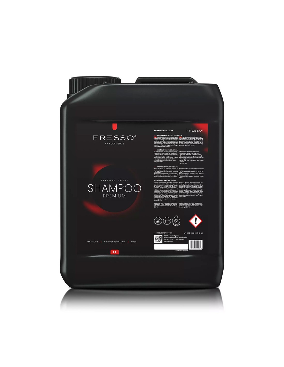 Wysoko skoncentrowany szampon do karoserii Fresso Premium Shampoo usunie z Twojego samochodu wszelkie zanieczyszczenia, tworząc na jego powierzchni łatwą do spłukania pianę. Dzięki wysoko skoncentrowanym składnikom jest niezwykle wydajny. Wystarczy zaledwie 35 ml na 10 L wody! Jest bezpieczny dla wosków i sealantów, pozostawiając auto nieskazitelnie czyste. Świeży i niezwykle finezyjny, perfumowany zapach produktu sprawia, że nie można przejść obok niego obojętnie. Cechy produktu: Doskonały poślizg Wysoka koncentracja (35 ml na 10 L) Neutralne pH Łatwe wypłukiwanie Bezpieczny dla wosków oraz sealantów. Zapach perfumowany: Cytrusowo-piżmowo-morski. Swobodny i lekki, musujący owocowo-kwiatowy zapach, który przywołuje jabłkami, sycylijskim cedrem i białą różą urok, kolory i zmysłową miękkość śródziemnomorskiego ducha wakacji. Sposób użycia: Usuń wstępny brud za pomocą wody. Wlej 35 ml szamponu do wiadra, następnie dodaj 10 litrów wody (zalecamy użycie ciepłej wody) Mycie rozpocznij od górnych części auta przemieszczając się ku dołowi. Nie dopuścić do pozostawienia produktu na karoserii. Dokładnie spłucz auto czystą wodą. Wysusz auto. Produkt używaj na chłodnym lakierze w zaciemnionym miejscu. Nie doprowadź do wyschnięcia produktu na karoserii. Zalecamy mycie metodą na dwa wiadra. Przechowuj w temperaturze powyżej 4 stopni Celsjusza w zaciemnionym miejscu. Pojemność: 5 L