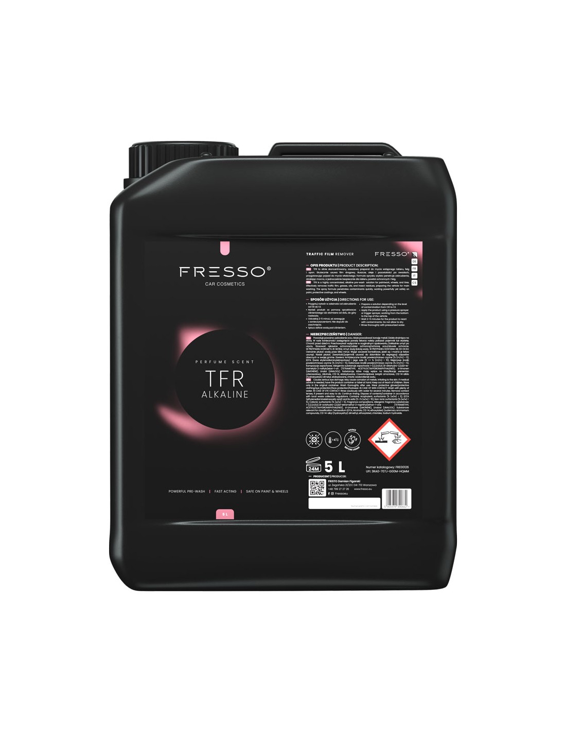 TFR to wydajny, wysoko skoncentrowany środek przeznaczony do mycia wstępnego lakieru, felg oraz opon. Skutecznie rozpuszcza i usuwa film drogowy, tłuszcze, oleje oraz pozostałości po owadach, dzięki czemu idealnie przygotowuje powierzchnię pojazdu do mycia właściwego. Zaawansowana formuła produktu szybko penetruje zabrudzenia, działając mocno, ale bezpiecznie dla lakieru, powłok ochronnych i elementów aluminiowych. TFR doskonale sprawdza się zarówno w codziennej pielęgnacji auta, jak i przy myciu mocno zabrudzonych pojazdów. Najważniejsze cechy: Wysoka skuteczność w usuwaniu brudu, tłuszczu i owadów Bezpieczny dla lakieru, powłok i felg Możliwość rozcieńczenia w zależności od poziomu zabrudzenia Szybkie i łatwe działanie w formie oprysku Idealny do myjni ręcznych i detailingu Sposób użycia: Przygotuj roztwór w zależności od zabrudzenia od 1:20 do 1:3. (1:10-1:3 dla silnie zabrudzonych powierzchni, zwłaszcza w okresach jesienno-zimowych; 1:20 dla lekko zabrudzonych powierzchni lub przy regularnej pielęgnacji). Nanieś produkt opryskiwaczem ciśnieniowym, zaczynając od dołu ku górze pojazdu Odczekaj 2–5 minut, aby preparat zadziałał (nie dopuszczając do zaschnięcia) Dokładnie spłucz wodą pod ciśnieniem Pojemność: 5 L