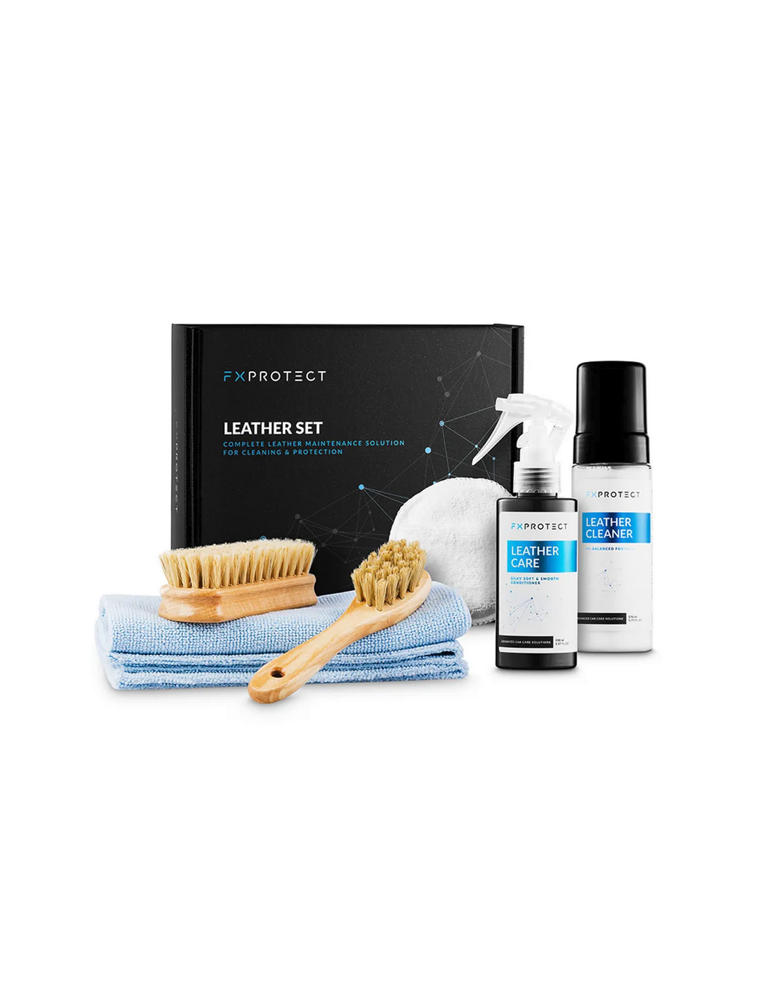 FX Protect Leather Set – to zestaw pielęgnacji tapicerki skórzanej, który zawiera niezbędne kosmetyki i akcesoria. Sprawią, że skóra będzie prezentowała się stylowo i pięknie przez wiele lat. Zachowa swoją miękkość i naturalne wykończenie.