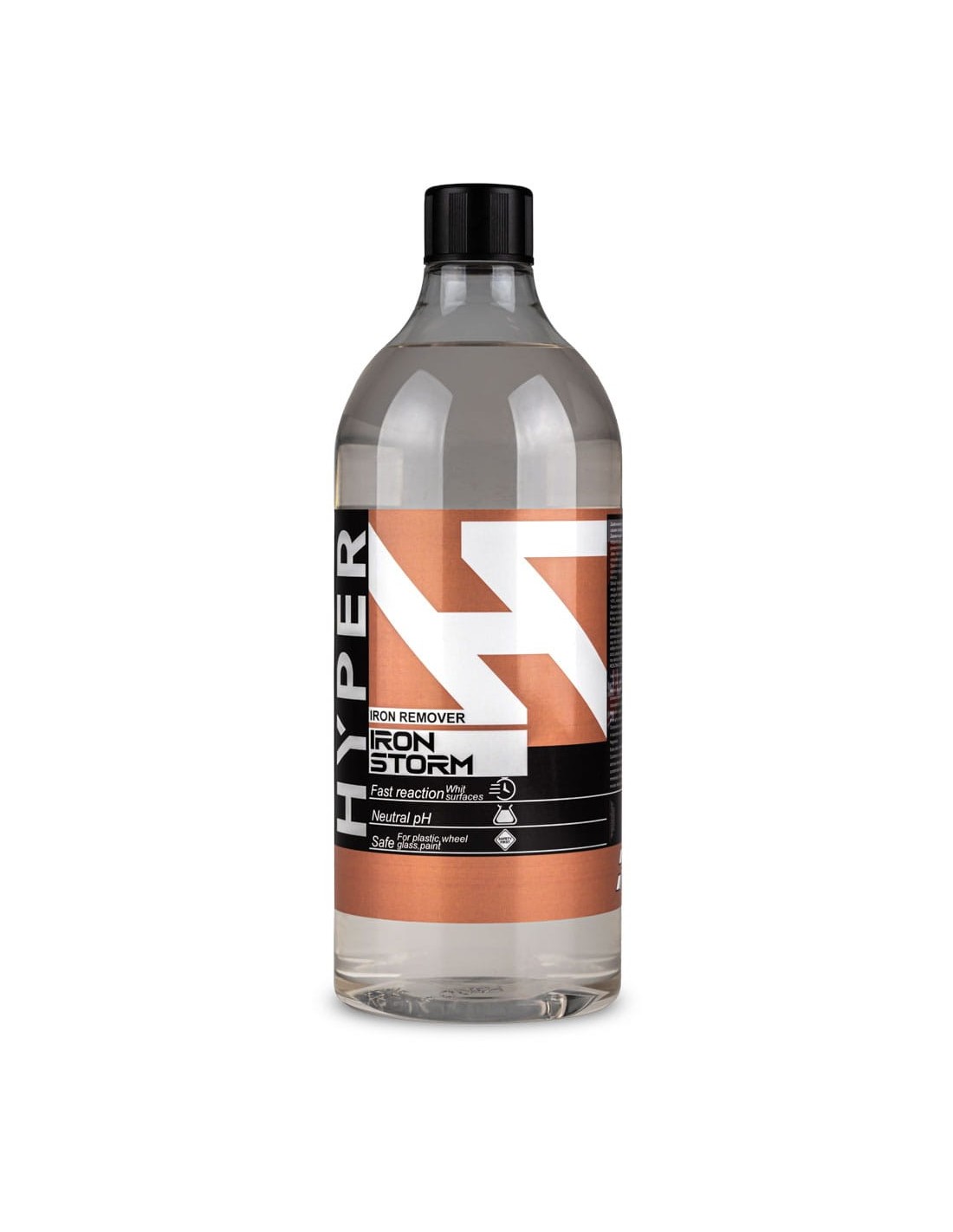 HyperHyper Iron Storm Iron Remover – produkt typu iron remover, gotowy do użycia. Neutralne pH produktu usuwa zanieczyszczenia pochodzenia metalicznego z lakieru, szkła, plastików, felg. Zaawansowana formuła natychmiast wchodzi w reakcje z osadami metalicznymi, rozpuszczając je na charakterystyczny kolor fioletowy. Zawarte w składzie środki powierzchniowo-czynne ułatwiają spłukanie produktu za pomocą myjki ciśnieniowej. Jako nieliczny nie posiada przykrego zapachu "zgniłego jajka", który jest charakterystyczny dla tego typu produktów.