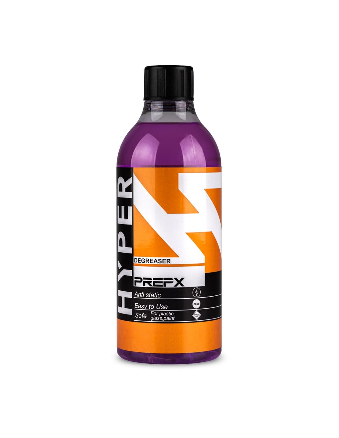 Hyper PrepX Degreaser – skuteczny, ale nie agresywny produkt do usuwania pozostałości po pastach polerskich. Zawarte składniki przygotowują lakier przed aplikacją powłok ceramicznych, wosków itp. Skuteczne odtłuszczenie pozwala zabezpieczeniom na mocne związanie z powierzchnią. Szybko odparowuje z powierzchni. Skutecznie czyści szyby i lustra.