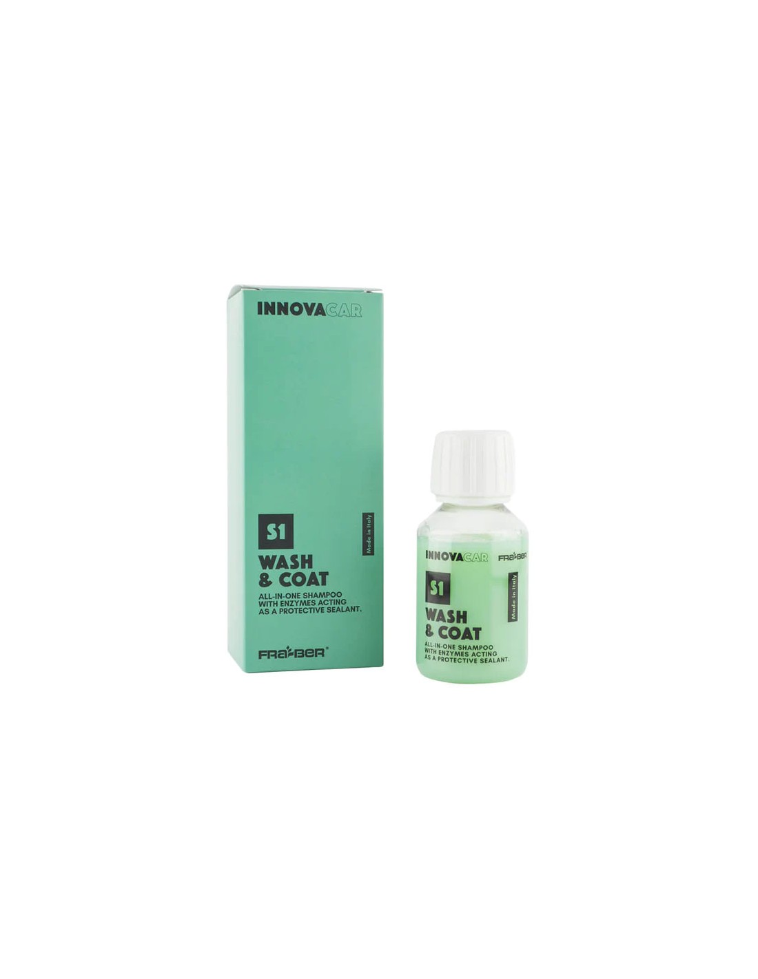 Innovacar S1 Wash & Coat – to idealny produkt do uzyskania wielu efektów w jednym: myje i czyści, uszczelnia i chroni, nadaje połysk i pozostawia efekt hydrofobowy. To idealne zaawansowane rozwiązanie czyszczące, redukujące kroki podczas mycia lub serwisowania samochodu, z nałożoną powłoką ceramiczną lub inną ochroną. Cechy produktu: Szampon samochodowy 3 w 1: to idealne rozwiązanie nanotechnologiczne, które skróci niezbędne etapy cyklu mycia, ponieważ myje, uszczelnia i pozostawia efekt hydrofobowy; S1 Wash&Coat łączy w jedno etap mycia i zabezpieczenia. Konserwacja powłoki i nanotechnologia: to idealny produkt do stosowania na cotygodniowe zabrudzenia, aby ożywić nanotechnologie i przedłużyć działanie wcześniej nałożonej powłoki. Tarcza ochronna SiO2: szampon przylega do powierzchni karoserii, tworząc barierę ochronną, która chroni ją przed czynnikami alkalicznymi i brudem. Wydłuża i chroni cykl życia powłoki oraz zastosowanych wcześniej zabezpieczeń nanotechnologicznych i ceramicznych. Ochrona UV: stworzona bariera chroni powierzchnię przed promieniami UV. Efekt odpychania wody: zapewnia hydrofobowy i śliski efekt utrzymujący się do 4 miesięcy. Głęboka dekontaminacja organiczna: Produkt został wzbogacony o enzymy, objęte ochroną patentową, do głębokiej dekontaminacji organicznej; w związku z tym może działać kilkakrotnie na cząsteczki brudu organicznego podłoża. Wysoka koncentracja: Znaczące i dogłębne czyszczenie i zdolność mycia jest gwarantowana nawet przy niewielkiej ilości S1 Wash&Coat. Średnie zużycie: W przypadku aplikacji za pomocą pianownicy lub wiadra: zalecane rozcieńczenie wynosi od 1:50 do 1:80, tj. użyj 20 ml do 10 ml produktu i wypełnij pozostałą część wodą (980 ml - 990 ml), aby uzyskać 1 L roztworu gotowego do użycia. W przypadku aplikacji lancą pianową lub pistoletem pianowym: zalecane rozcieńczenie wynosi 1:3, tzn. należy użyć 250 ml produktu i wypełnić pozostałą część wodą (750 ml), aby uzyskać 1 L gotowego do użycia roztworu. Podczas dozowania rzeczywiste końcowe rozcieńczenie może osiągnąć około 1:60. Do czyszczenia konserwacyjnego uszczelnień lub powłok: zalecane rozcieńczenie wynosi od 1:80 do 1:150, tj. użyć 10 ml do 7 ml produktu i wypełnić pozostałą część wodą (990 ml - 993 ml), aby uzyskać 1 L gotowego do użycia roztworu. Odczekaj do 7 godzin po aplikacji dla pełnej aktywacji. Efekt utrzymuje się do 4 miesięcy. W1 Quick Detailer może być stosowany do usuwania śladów po wyschnięciu produktu. Podsumowanie danych technicznych: Efekt hydrofobowy: 5/5 Zdolność samooczyszczania: 5/5 Połysk: 4/5 Działanie czyszczące: 3/5 Trwałość: 3/5 Schnięcie: 1 godzina Czas utwardzania: po 7 godzinach Z enzymami: TAK pH: 6,50 Pojemność: 100 ml