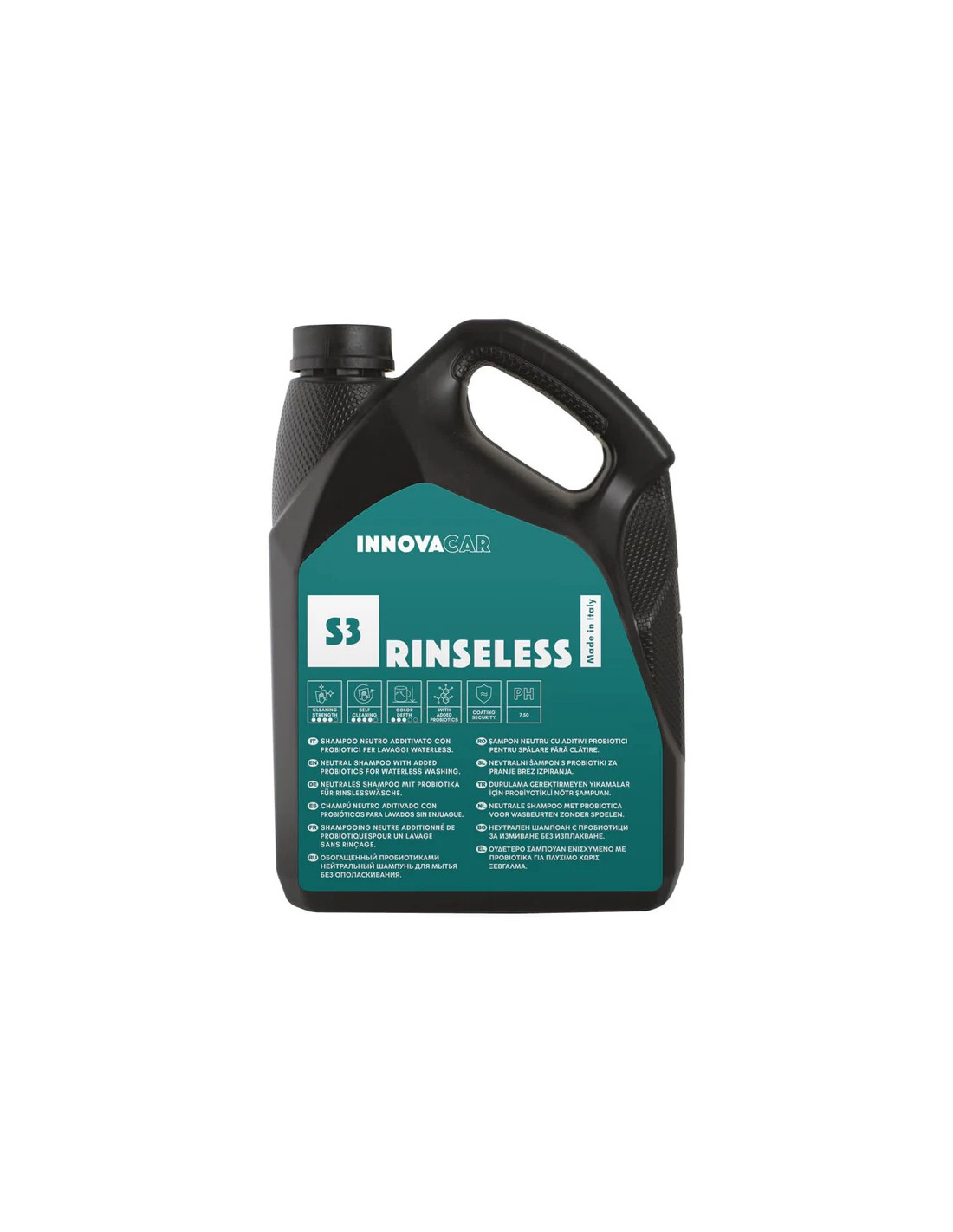 S3 Rinseless marki Innovacar to szampon do mycia samochodu bez spłukiwania, wolny od środków ochronnych (polimerów lub silikonów), co pozwala na późniejsze nałożenie środków ochronnych, takich jak powłoki, woski itp. To idealne rozwiązanie dla osób poszukujących detergentu, który minimalizuje zużycie wody, nie rezygnując z potrzeby utrzymania samochodu w czystości. Główne cechy: Technologia Biotics: produkt wzbogacony o opatentowane probiotyki do głębokiego czyszczenia. Bez ingerencji w powłoki: formuła bez środków ochronnych to idealne rozwiązanie przed aplikacją powłoki ceramicznej lub wosku. Przyjazny dla środowiska: unikalna formuła wzbogacona o naturalne probiotyki i w pełni biodegradowalne środki powierzchniowo czynne zgodnie z rozporządzeniem 648/2004 sprawia, że jest to wybór przyjazny dla środowiska. Oszczędność wody: ten produkt pomaga oszczędzać wodę, a jednocześnie utrzymać samochód w czystości. Nadaje się również jako środek wspomagający osuszanie: można go stosować na etapie osuszania, zmniejsza ryzyko osadzania się kamienia na powierzchni. Łatwa aplikacja: formuła na bazie wody umożliwia stosowanie na mokrych i suchych powierzchniach. Średnie zużycie: Na zewnątrz: 150 ml/samochód. Podsumowanie danych technicznych: Działanie czyszczące: 4/5 Zdolność samoczyszczenia: 4/5 Głębia koloru: 3/5 Wzbogacony o probiotyki: TAK Bezpieczeństwo powłoki: : TAK PH: 7,5 Jak umyć samochód bez spłukiwania, stosując S3 Rinseless: Rozcieńcz produkt w wiadrze w stosunku od 1:100 do 1:250, tj. użyj od 50 ml do 20 ml produktu i uzupełnij wodą (od 4950 ml do 4980 ml), aby uzyskać 5 l gotowego do użycia roztworu. Poczekaj, aż powierzchnia ostygną. Pracuj na małych obszarach na raz, używając wysokiej jakości rękawic. Napełnij butelkę z podziałką lub dozownik ze spryskiwaczem świeżo przygotowanym roztworem, a następnie spryskaj obszar, który ma zostać poddany czyszczeniu, aby zmiękczyć brud, upewniając się, że produkt nie wyschnie. Na koniec spłucz rękawicą lub gąbką wcześniej namoczoną w samej wodzie i osusz czystą ściereczką z mikrofibry. Zalecamy stosowanie metody dwóch wiader. Jak umyć samochód bez wody, używając S3 Rinseless: Rozcieńcz produkt w stosunku 1:100, tj. użyj 10 ml produktu i uzupełnij wodą (910 ml), aby uzyskać 1 l gotowego do użycia roztworu. Odczekaj, aż powierzchnie ostygną. Pracuj na małych obszarach na raz, równomiernie nakładając produkt na suchą lub mokrą powierzchnię. Odczekaj 15-20 sekund przed usunięciem produktu, pozwalając brudowi zmiękczyć brud. Złóż czystą szmatkę na cztery części, aby zminimalizować liczbę szmatek potrzebnych do mycia. Użyj pierwszej strony na powierzchni, pracując w jednym kierunku i stopniowo podnosząc szmatkę podczas wycierania, aby usunąć brud. Zakończ czyszczenie czystą i suchą szmatką wykończeniową. Wyczyść następny obszar, używając drugiej czystej strony wcześniej złożonej szmatki i powtórz proces. Ostrzeżenia: Zalecamy, aby nie stosować produktu na gorących powierzchniach lub w bezpośrednim świetle słonecznym. Nie dopuścić do wyschnięcia produktu na powierzchni. Na dnie butelki może znajdować się osad, typowy dla obecności probiotyków; dlatego zaleca się wstrząśnięcie produktem przed użyciem. Pojemność 4,54 L