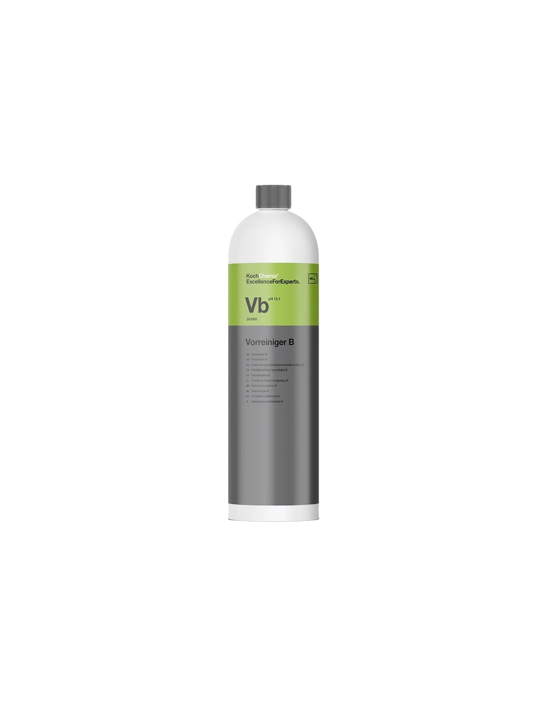 Koch Chemie Vorreiniger B – jest mocno skoncentrowanym, alkalicznym i wysoko pieniącym specjalnym środkiem czyszczącym przeznaczonym do wstępnego mycia samochodów osobowych i ciężarowych. Kombinacja wysokowartościowych związków chemicznych, mających właściwości powierzchniowo czynne, rozpraszają w mgnieniu oka nie tylko ogólny bród i kurz uliczny, ale również uparte zabrudzenia jak insekty, ptasie ekskrementy i inne statyczne zanieczyszczenia. Inhibitory korozji zapewniają wysoką wytrzymałość elementów takich jak np. anodyzowanego aluminium. Czyszczenie felg 1:4 do 1:8 Czyszczenie wstępne: od 1:30 do 1:50 Usuwanie insektów 1:10 do 1:30 Mocno zabrudzone wnętrza pojazdu 1:10 do 1:20 Odwoskowywanie (copolymer) 1:5 do 1:10 Mycie silnika 1:10 do 1:20 Samoobsługowe mycie pod wysokim ciśnieniem: 1: 300 Pojemność: 1 L