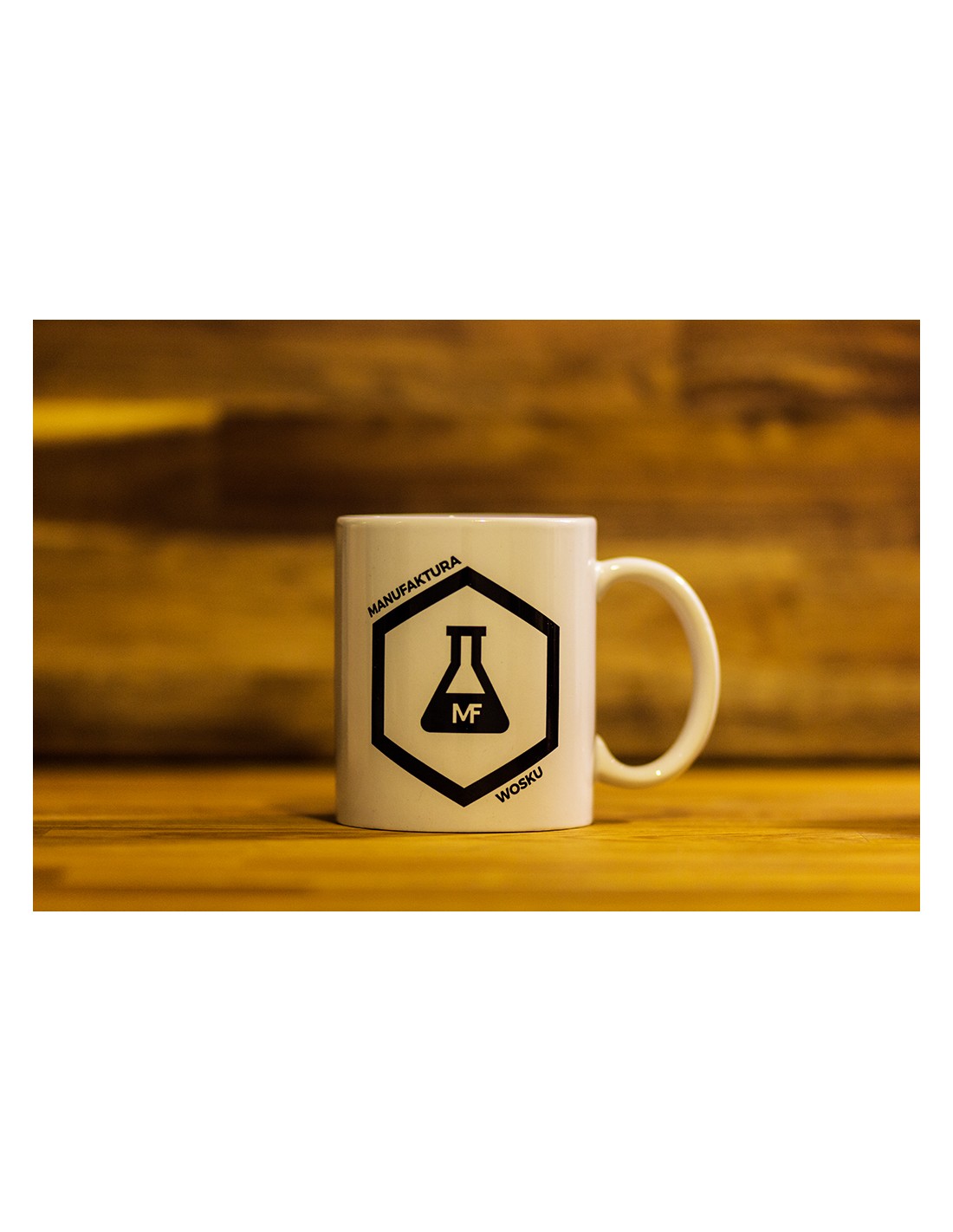 Biały kubek do kawy 300 ml Manufaktura Wosku z obustronnym nadrukiem.
