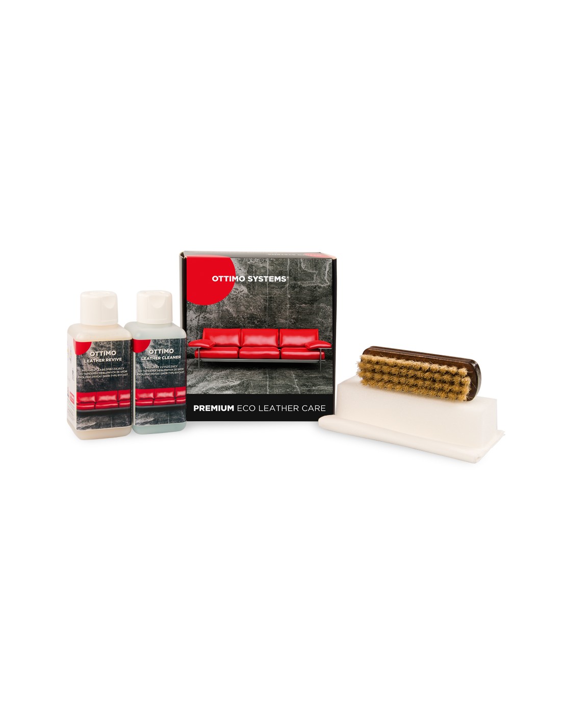 Kompletny zestaw do czyszczenia i zabezpieczania tapicerek meblowych wykonanych ze skór typu Bycast oraz materiałów skóropodobnych (ekoskóra, winyl, skaj). Zestaw zawiera: 1 x 250 ml OTTIMO Leather Cleaner: Środek na bazie wody do czyszczenia wszystkich typów skór. Łagodny dla skóry, zachowuje jej elastyczność i miękkość. Nie pozostawia smug i zacieków nawet na mocno matowych tapicerkach. Posiada neutralne dla skóry ph. Produkt przebadany dermatologicznie. Nie stosować do nubuku i zamszu. 1 x 250 ml OTTIMO Leather Revive: Preparat o kremowej konsystencji, na bazie wody przeznaczony do skór typu Bycast, materiałów skóropodobnych (ekoskóra, winyl, skaj). Technologia HYDROGUARD zabezpiecza przed plamami pochodzenia wodnego, tłuszczowego i alkoholowego. Zawiera filtr UV spowalniający proces płowienia koloru. Usuwa efekt „skrzypienia” skóry. Produkt przebadany dermatologicznie. Nie stosować do nubuku i zamszu. 2 x ściereczka tekstylna 1 x szczoteczka 1 x gąbka 1 x broszura informacyjna