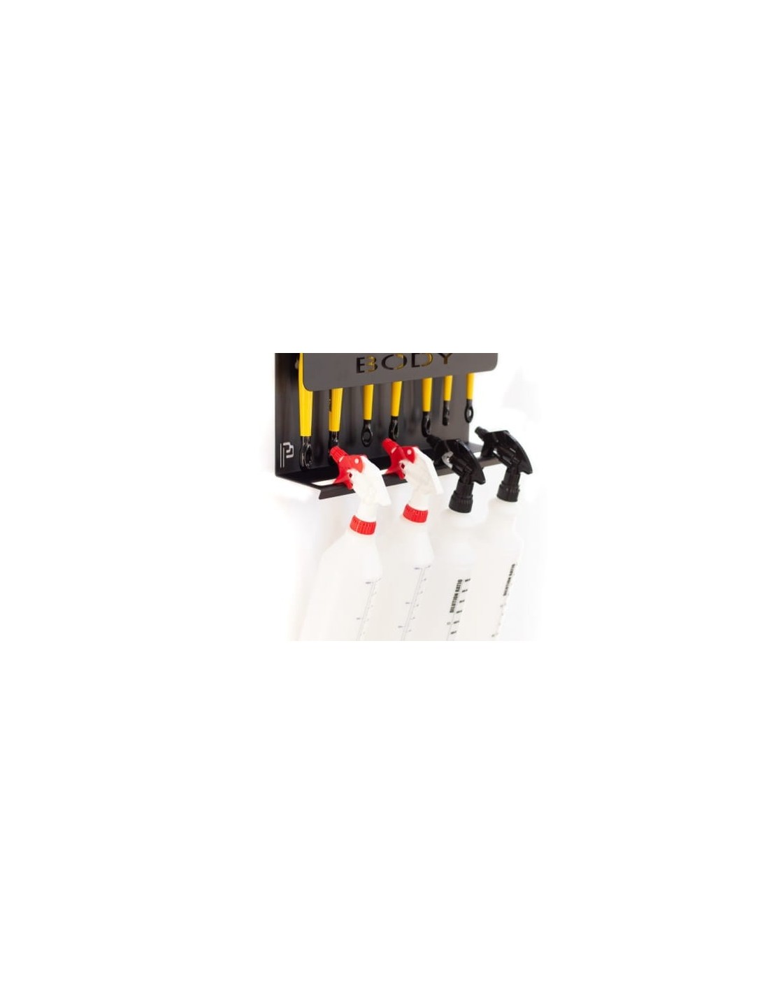 Górne otwory pasują do większości rozmiarów pędzelków natomiast dolne korytka pasują do większości typów atomizerów oraz opryskiwaczy. Solidna konstrukcja bezpeicznie udźwignie ponad 10 kg obciążenia.