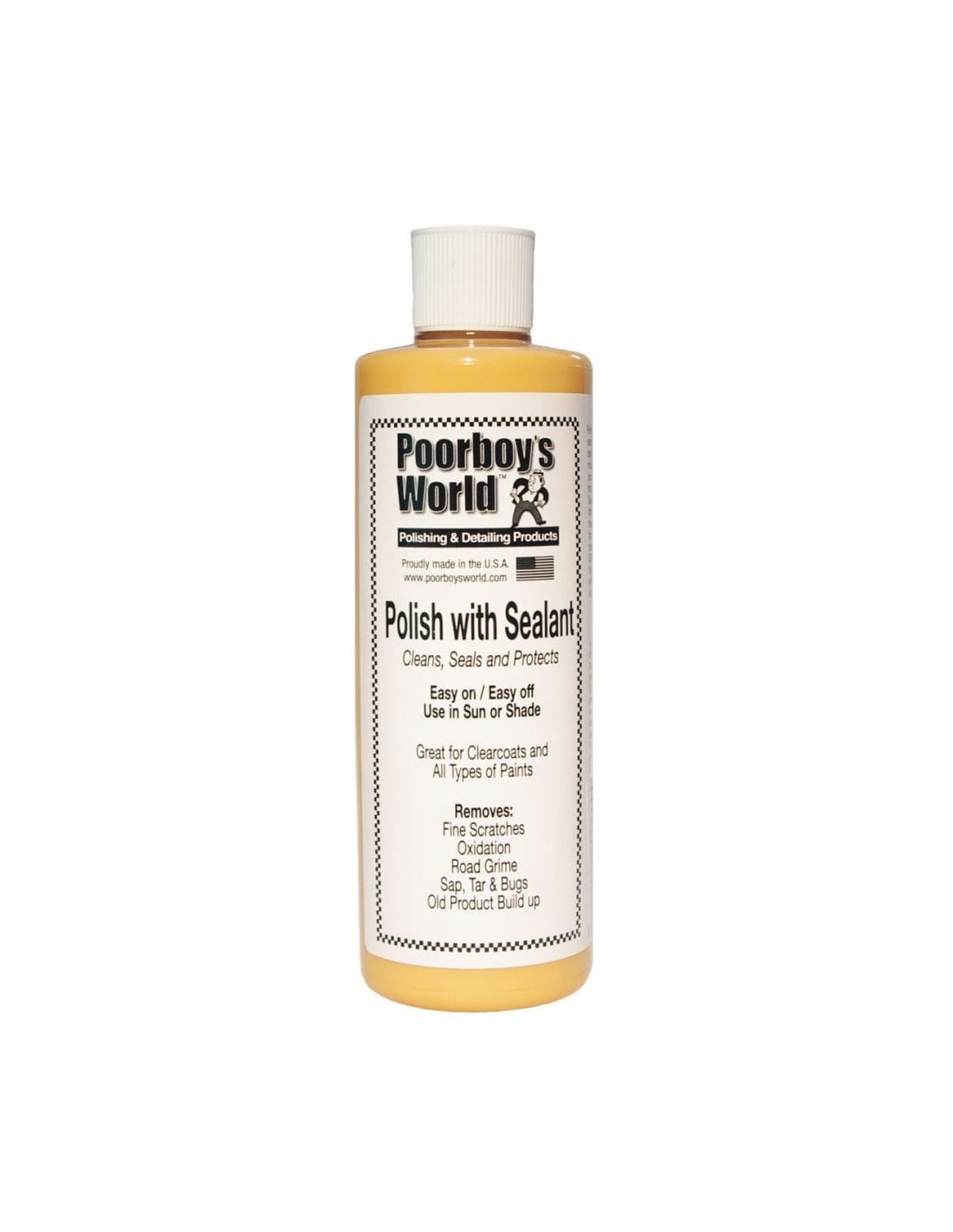 POORBOY’S Polish with Sealant to produkt typu AIO (All In One). Za pomocą jednej łatwej aplikacji oczyszcza lakier oraz zabezpiecza go. Nie zawiera ścierniwa, oczyszcza skutecznie lakier bazując na chemicznych właściwościach czyszczących. Dzięki zawartości syntetycznych polimerów zapewnia ochronę oraz głębię koloru i połysk. Idealny wybór dla osób nie mogących poświęcić dużej ilości czasu na przeprowadzenie złożonego procesu pielęgnacji lakieru kilkoma różnymi środkami. Krótko zwięźle i na temat, za jednym zamachem zapewnia doskonałą prezencję samochodu.