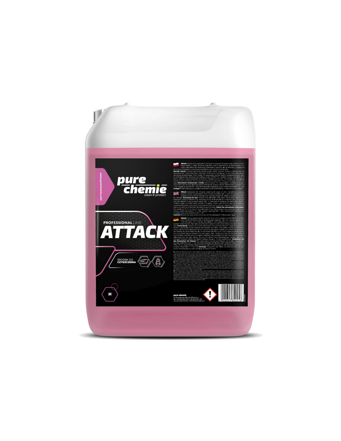 Pure Chemie Attack – to wszechstronny preparat czyszczący do większości rodzajów zabrudzeń, takich jak plamy z oleju, tłuszczu, napojów, plamy organiczne, przebarwienia z innych materiałów itp. Produkt może być stosowany jako oprysk, jak i z pianownicy. Przeznaczony do prania materiałów, czyszczenia plastików i innych powierzchni.