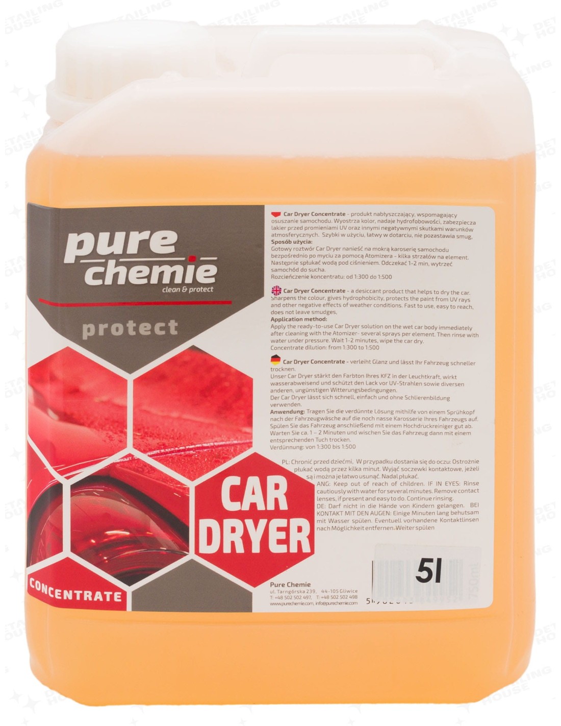 Pure Chemie Car Dryer Concentated – to potocznie nazywany wosk na mokro. Bardzo dobre rozwiązanie dla osób które nie mają czasu na tradycyjne woskowanie lub aplikację quick detailerów. Na półkach zagorzałych detailerów również powinno znaleźć się miejsce dla Car Dryera. Można wspomóc się podczas osuszania samochodu przed procesem polerowania kiedy mamy taflę wody lub do szybkiej poprawy zrzutu wody na słabnącym wosku.