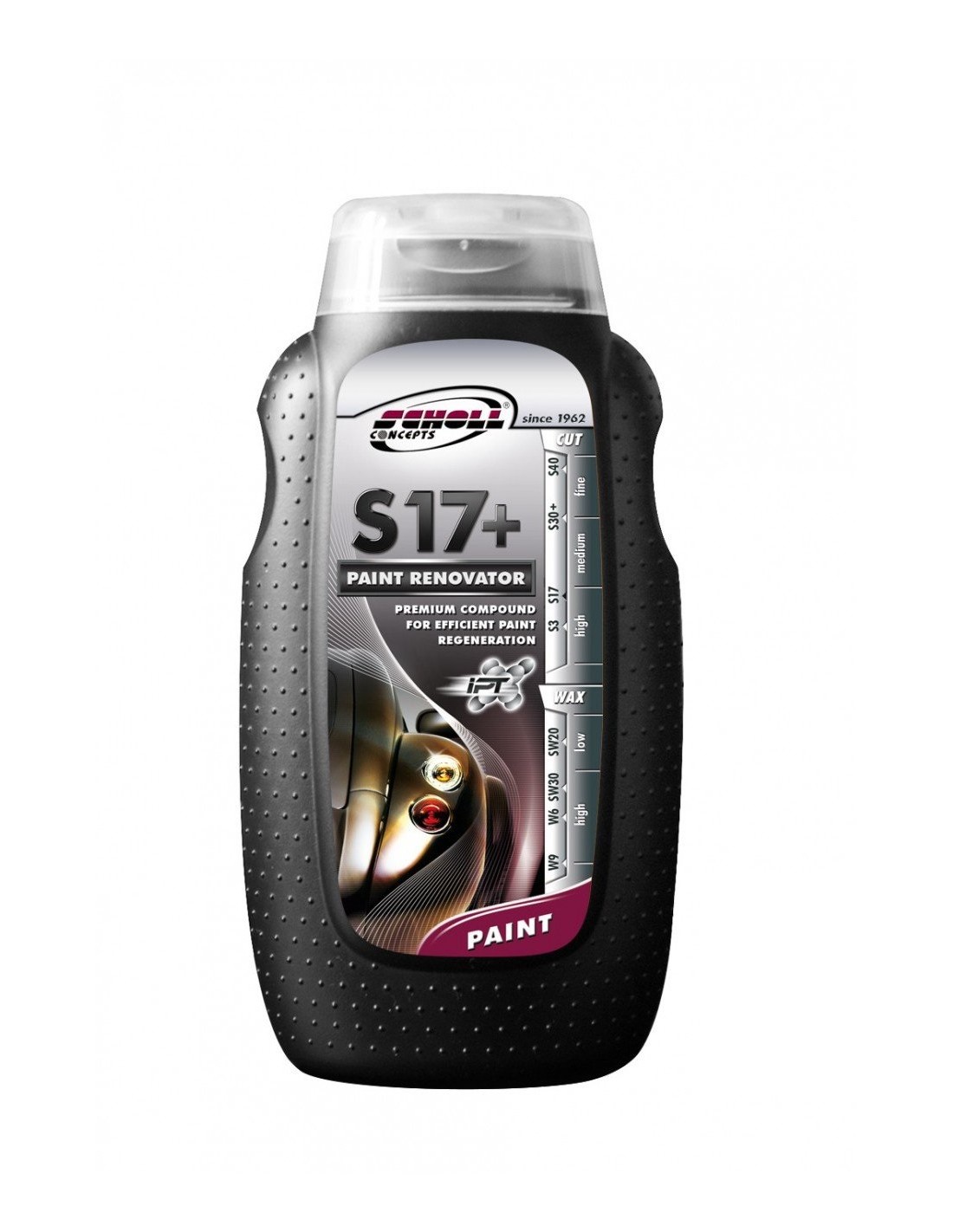 SCHOLL CONCEPTS S17+ Rubbing Compound zapewnia doskonałą wydajność cięcia w połączeniu z lustrzanym połyskiem i minimalnym pyleniem podczas pracy.