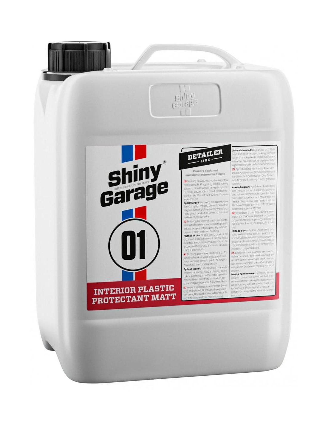 Shiny GarageShiny Garage Interior Plastic Protectant Matt – to zabezpieczający dressing do plastików wewnętrznych, będący kombinacją emulsji silikonowych, składników antystatycznych i anty-UV, oraz składników utrwalających efekt. Pozostawia matowe wykończenie i mocno przyciemnia powierzchnię. Odporny na działanie detailerów do wnętrza.