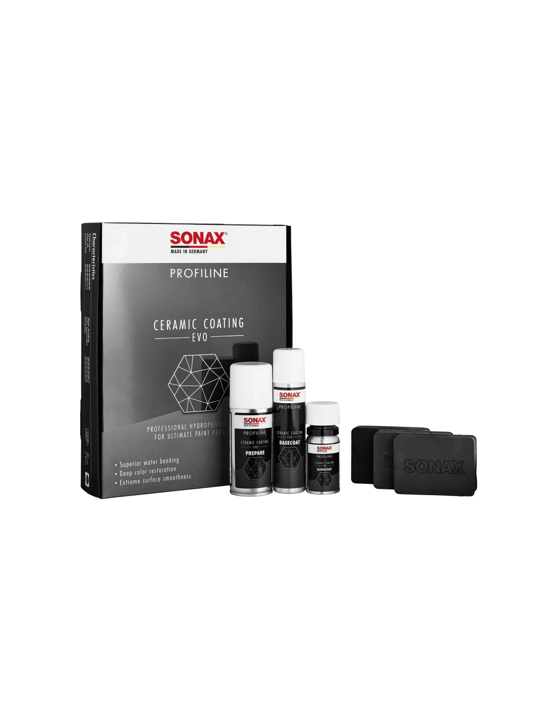 Sonax Profiline Ceramic Coating CC EVO to kompletny zestaw potrzebny do aplikacji długotrwałego zabezpieczenia ceramicznego. Zestaw zawiera dwie powłoki ceramiczne - BaseCoat Evo i GlossCoat Evo, podstawowy środek do czyszczenia i odtłuszczania lakieru - Prepare, a także trzy aplikatory. Podobnie jak lakier samochodowy, BaseCoat Evo i GlossCoat Evo składają się z sieci polimerowej różnych ciekłych żywic na bazie krzemu i węgla oraz środków wiążących zawieszonych w rozpuszczalnikach. W kontakcie z powierzchnią składniki reagują niezależnie ze sobą i łączą się, tworząc bardzo solidną i odporną na chemikalia produkty. Powłoka zmniejsza napięcie powierzchniowe lakieru co oznacza, że ciała obce takie jak brud, nie mogą już mocno przylegać do lakieru. Nazywa się to efektem samoczyszczenia lakieru. Upraszcza to mycie pojazdu - czasem wystarczy silny strumień wody aby usunąć brud. Sposób użycia: Powierzchnia musi być umyta i wypolerowana za pomocą maszyny na wysoki połysk bez hologramów. Bezpośrednio przed aplikacją musi być absolutnie czyste. W tym celu nanieść niewielką ilość Prepare na ściereczkę z mikrofibry i dokładnie przetrzyj wszystkie powierzchnie które mają być zabezpieczone Krok 1 Nanieś niewielką ilość BaseCoat na jasną stronę aplikatora i nakładaj przemiennie w pionie i poziomie aby dokładnie pokryć całą powierzchnię. Pozostaw na chwilę do odparowania a następnie delikatnie przetrzyj powierzchnię ściereczką z mikrofibry, tak aby uzyskać gładkie wykończenie. Następnie przejdź do kolejnego fragmentu. Zawsze nanoś w taki sposób aby obszary aplikacji zazębiały się. Po zabezpieczeniu całej powierzchni sprawdź wizualnie dokładność aplikacji i w razie potrzeby natychmiast usuń wszelkie nieprawidłowości. Po aplikacji BaseCOat należy odczekać minimum 1 godzinę aby proces sieciowania mógł się zakończyć. Przez ten czas powierzchnia nie może być dotykana ani mieć kontaktu z wodą. Krok 2 Nanieś kilka kropli GlossCoat na jasną stronę nowego aplikatora i nałóż cienką warstwę na lakier.Produkt powinien odparowywać przez 5-10 minut, potem należy zetrzeć nadmiar za pomocą delikatnej mikrofibry do uzyskania połysku i powierzchni pozbawionej smug. Nakłądaj w ten sam sposób na cały pojazd jak w kroku pierwszym, a następnie poczekaj co najmniej 4 godziny w celu całkowitego utworzenia się powłoki. W tym czasie zabezpieczona powierzchnia nie może być dotykana ani mieć kontaktu z wodą. Na koniec przeprowadź inspekcję pojazdu. Jeśli aplikator zacznie twardnieć podczas nakładania GlossCoat, należy wymienić go na zapasowy, który został dołączony do zestawu. Gąbkę do aplikacji i ściereczki z mikrofibry używane podczas pracy należy natychmiast wyprać, aby uniknąć późniejszych mikro zarysowań.