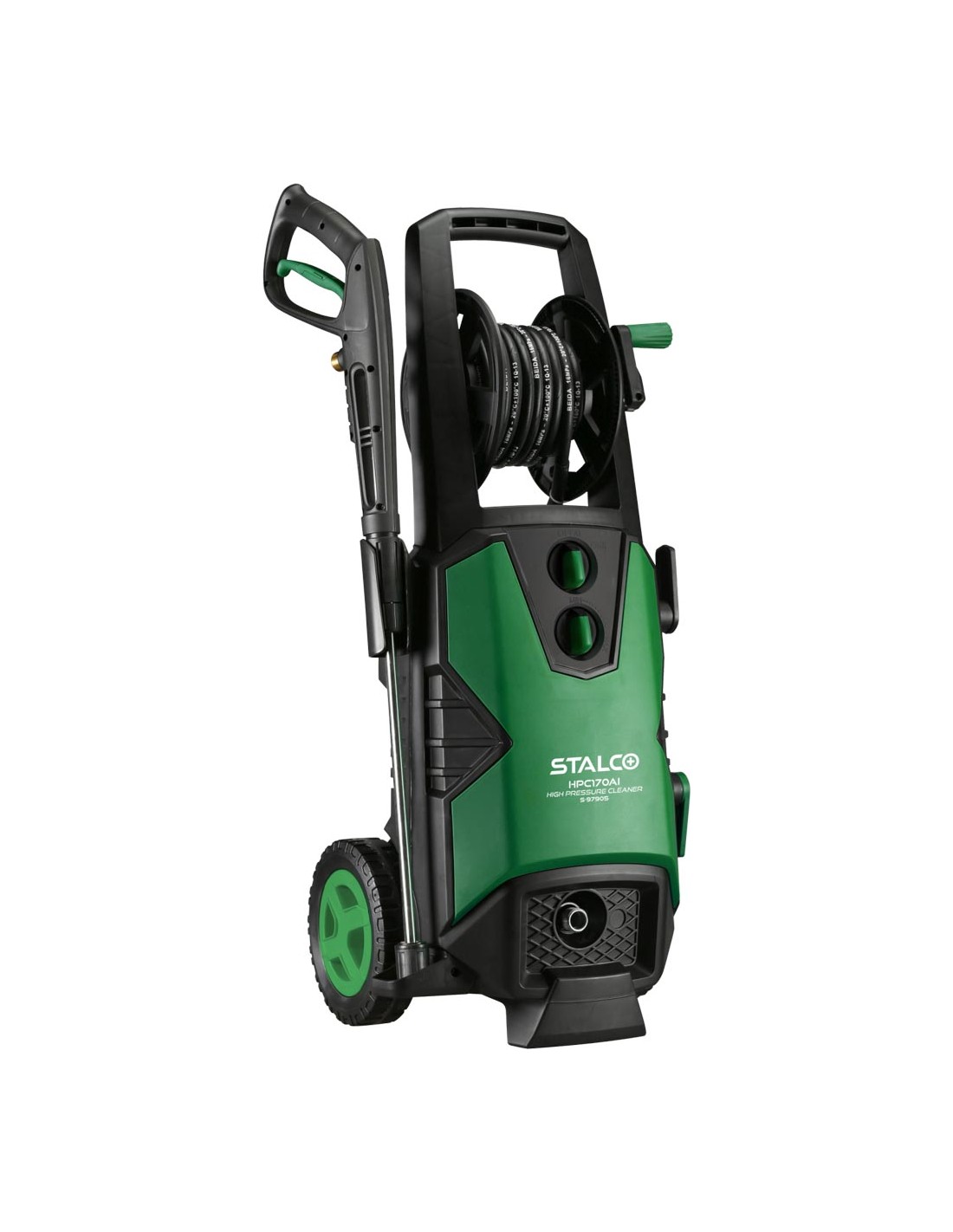 Myjka Stalco HPC170AI przeznaczona jest do usuwania trudnych zabrudzeń przy użyciu wody pod wysokim ciśnieniem. Sprawdza się przy myciu pojazdów, maszyn budowlanych, elewacji i podjazdów. Urządzenie osiąga maksymalne ciśnienie 170 bar i przepływ wody do 468 l/h. Pompa ssąco-tłocząca wykonana jest z aluminium, co zapewnia odporność na korozję i dobre przewodnictwo cieplne. Myjka może pobierać wodę bezpośrednio ze zbiornika, nie wymaga podłączenia do sieci wodnej, a wbudowany dozownik pozwala regulować ilość używanego detergentu. Urządzenie wyposażono w funkcje automatycznego zatrzymania oraz ochronę przed przegrzaniem. Dla wygody transportu myjka posiada uchwyt na pistolet i wózek z kołami. Cechy: Silnik indukcyjny z uzwojeniem miedzianym Pompa aluminiowa Pompa samozasysająca Zbiornik na detergent z regulacją dozowania Funkcja auto-stop Ochrona przed przegrzaniem Bęben na wąż Dane techniczne: Moc znamionowa: 2500 W Napięcie: 220-240 V, 50 Hz Ciśnienie znamionowe: 130 bar Maksymalne ciśnienie robocze: 170 bar Maksymalny przepływ: 7,8 l/min (468 l/h) Maksymalne ciśnienie wlotowe: 7 bar Waga: 24,5 kg Klasa ochronności: I, IPX5 Długość węża: 8 m Długość przewodu zasilającego: 5 m Zestaw zawiera: Pistolet z mosiężnym złączem Lanca turbo Lanca regulowana Wąż wysokociśnieniowy 8 m w stalowym oplocie Szczotka uniwersalna Adapter do akcesoriów Filtr wody