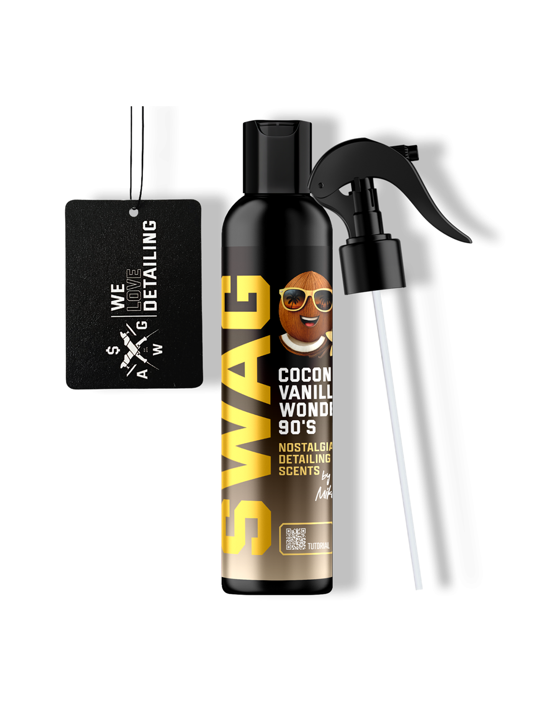 Zapach to najsilniejszy znany nauce nośnik wspomnień. Seria NOSTALGIA SCENTS to coś więcej niż korekta atmosfery wnętrza - to precyzyjnie zaprojektowany bilet do czasów, które ukształtowały współczesną kulturę motoryzacyjną. Wystarczy chwila i pierwsze rozpylenie esencji, by wywołać natychmiastowe deja vu. Nasza kompozycja stanowi olfaktoryczny fundament dla wspomnień, które budowały Twoją pasję. To powrót do autentyczności, zamknięty w nowoczesnej, wysoko skoncentrowanej formule. Przenosimy Cię do momentów, gdy zapach był integralną częścią tożsamości kierowcy, a każda pokonana trasa zapisywała się w pamięci dzięki unikalnym, ikonicznym aromatom. Seria NOSTALGIA BACK TO THE 90' przywołuje momenty, w których charakter wnętrza definiował kultowy aromat drzewka, a poczucie wolności dopełniał smak kultowego, owocowego napoju. Swag NOSTALGA SCENTS to hołd dla doświadczeń, które zdefiniowały pokolenie entuzjastów. Przywołujemy emocje bez kompromisów i bez półśrodków. Długotrwały zapach | Kokos i wanilia | Orzeźwiający aromat Poczuj ciepło wakacyjnych wspomnień i słodką beztroskę letnich dni. Zapach Swag COCONUT VANILLA WONDER 90’s to nie tylko aromat - to powrót do słonecznych chwil, kremowej słodyczy i egzotycznej lekkości, które przywołują klimat lata w najlepszym, nostalgiczno-nowoczesnym wydaniu. Delikatna nuta kokosa łączy się z aksamitną wanilią, tworząc otulającą, harmonijną kompozycję, która wypełnia wnętrze pojazdu ciepłą i relaksującą aurą. Zabierz ten zapach w każdą podróż - stanie się on Twoim codziennym towarzyszem, który zamienia zwykłą jazdę w przyjemne, wakacyjne doświadczenie. Swag COCONUT VANILLA WONDER 90’s to synonim komfortu, słodyczy i subtelnej elegancji, który nadaje wnętrzu samochodu wyjątkowo przytulny charakter. Swag COCONUT VANILLA WONDER 90’s to wysokiej jakości zapach samochodowy z linii NOSTALGIA SCENTS, stworzony z myślą o miłośnikach słodkich, kremowych kompozycji oraz profesjonalnych Studiach Detailingowych. Produkt wyróżnia się wyważonym połączeniem egzotycznego kokosa i ciepłej wanilii, które wprowadzają do wnętrza pojazdu nutę relaksu i przyjemnej świeżości. Zapach został opracowany na bazie starannie wyselekcjonowanych składników, zapewniając długotrwałe działanie i bezpieczne użytkowanie. Swag COCONUT VANILLA WONDER 90’s charakteryzuje się zaawansowaną formułą, która skutecznie neutralizuje nieprzyjemne zapachy, jednocześnie nadając wnętrzu pojazdu słodki, otulający charakter. Kompozycja została zaprojektowana tak, aby stopniowo uwalniać kremowe, kokosowo-waniliowe nuty, tworząc trwałe i przyjemne doznania zapachowe. Swag COCONUT VANILLA WONDER 90’s to idealny wybór dla osób, które chcą wprowadzić do wnętrza samochodu atmosferę lata, komfortu i subtelnej słodyczy. Dzięki innowacyjnej technologii dyfuzji zapach równomiernie rozprowadza się w kabinie, zapewniając długotrwałą świeżość i przyjemność każdej podróży. WŁAŚCIWOŚCI Intensywny, głęboki zapach kokosu i wanilii Długotrwałe działanie Bezpieczny dla wnętrz pojazdów Neutralizuje nieprzyjemne zapachy Wyrazista, orzeźwiająca kompozycja Łatwy w użyciu Idealny dla Studiów Detailingowych i Entuzjastów SPOSÓB UŻYCIA Przed użyciem: Delikatnie wstrząśnij butelką, aby równomiernie rozprowadzić kompozycję zapachową. Pierwsza aplikacja: Spryskaj obficie zapachem Swag COCONUT VANILLA WONDER 90's na dołączoną do zapachu zawieszkę (aż stanie się wilgotna i lekko spuchnie) i inne tekstylne elementy wnętrza pojazdu. Dawkowanie: Aplikuj zapach według własnych preferencji, dbając o umiarkowaną ilość, aby uniknąć nadmiernego nasycenia wnętrza. Odświeżanie: W razie potrzeby powtarzaj aplikację, aby utrzymać stały poziom zapachu. DODATKOWE ZALECENIA Nie przemrażać. Przed użyciem wstrząsnąć. Chronić przed światłem słonecznym. Przechowywać w chłodnym i suchym miejscu. ZESTAW ZAWIERA 1 x zapach samochodowy Swag COCONUT VANILLA WONDER 90's / 150ml 1 x zawieszka WE LOVE DETALING / SWAG DETAILING COSMETICS