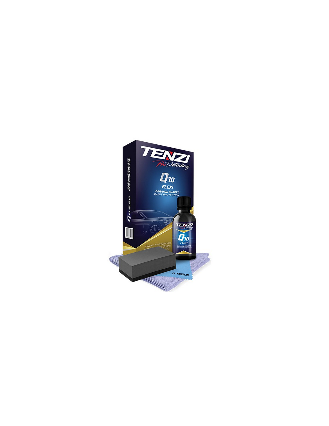 Tenzi ProDetailing Q10 Flexi – elastyczna powłoka kwarcowa do zabezpieczania lakieru samochodowego. Elastyczny profesjonalny preparat na bazie oligomeru prepolimeru Si14O2, który dzięki nowej, ulepszonej formule zapewnia perfekcyjny wygląd i zabezpieczenie lakieru. Tworzy superhydrofobową powłokę, która dzięki swojej elastyczności jest bardziej odporna na uszkodzenia (uderzenia kamieni, zarysowania). Q10 to gwarancja długotrwałej, wytrzymałej ochrony przed wilgocią, solą, temperaturą, czynnikami atmosferycznymi i promieniami UV. Wyciąga głębię koloru i ożywia barwę, tworząc efekt lustrzanego odbicia.